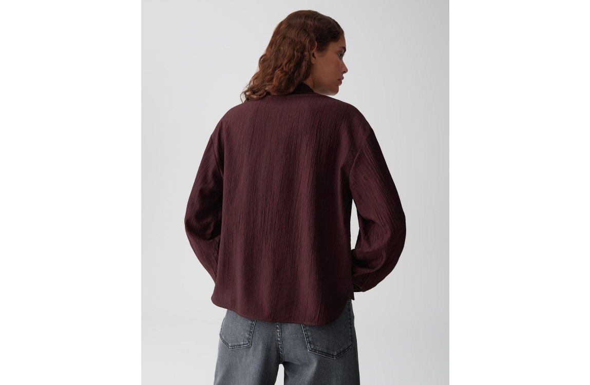 Opus Fomantica 40039 Dark grape. Dit rechtvallende model is voorzien van een v-hals met een strik detail en heeft lange mouwen. Deze burgundy blouse van Opus is uitgevoerd met een subtiele kreuktextuur. Dit model is langer aan de achterkant dan aan de voorkant.