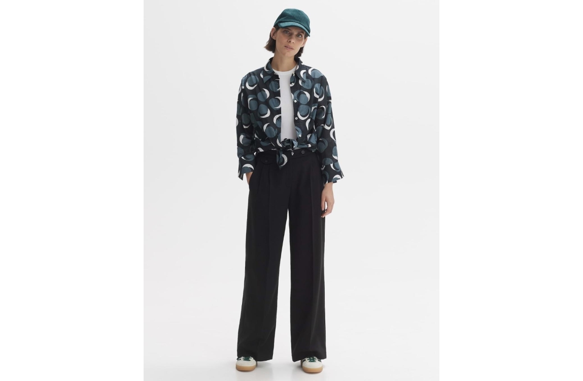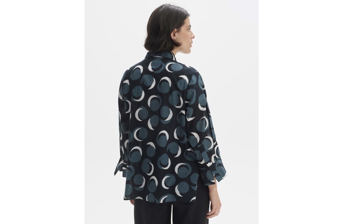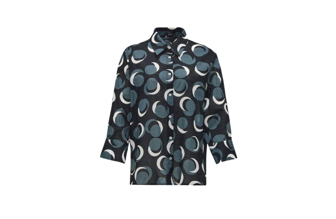 Opus blouse Fumina City 10177812386. Dit rechtvallend model heeft een kraag en lange mouwen. Deze zwarte blouse van Opus is all-over bewerkt met verschillende figuren in de kleuren: blauw en grijs. Dit model sluit aan de voorzijde en is semi-transparant.
