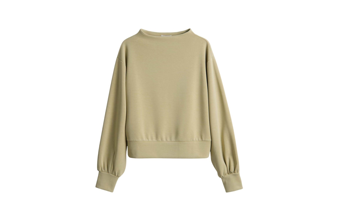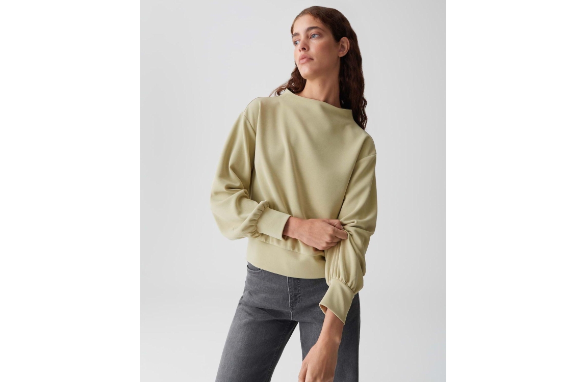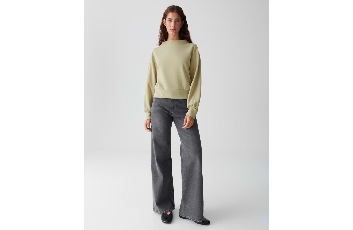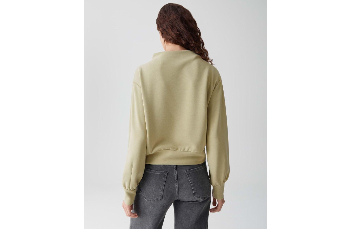 Opus Gablina 30041 Soft macha. Dit rechtvallende model is voorzien van een trechterhals en lange mouwen. Dit licht groene sweatshirt is afgewerkt met boorden en is uitgevoerd in een zachte stof. Het model is 177 cm en draagt maat 36.