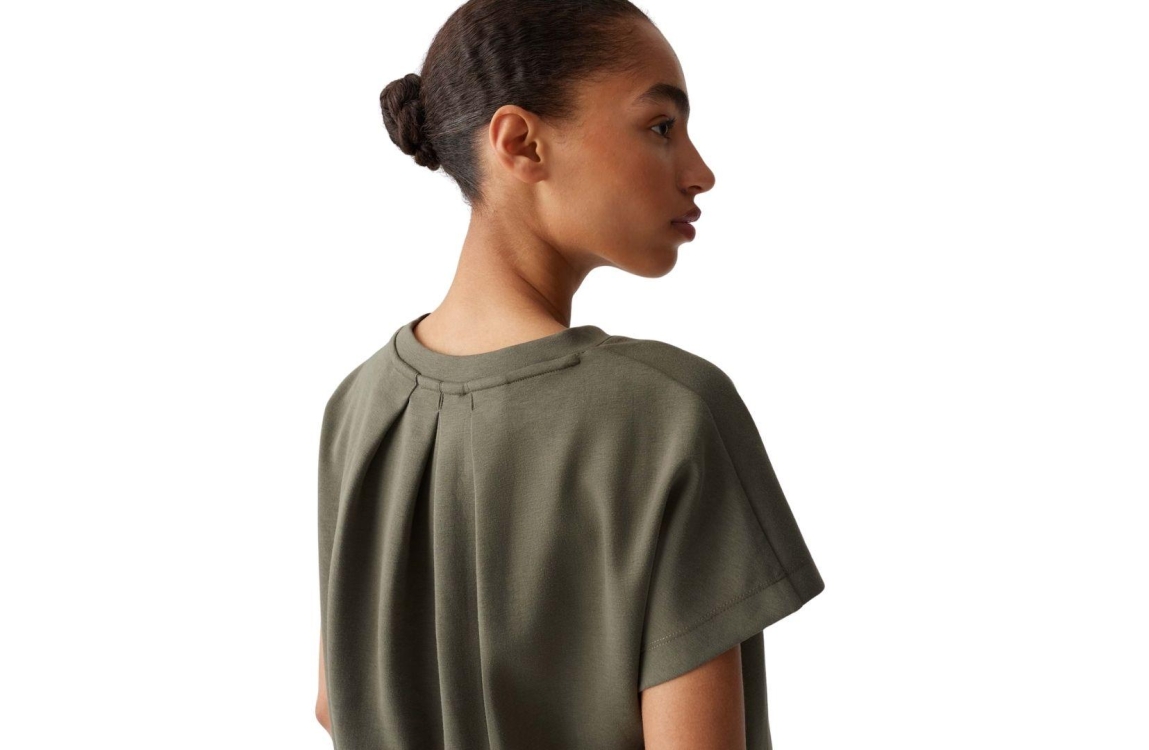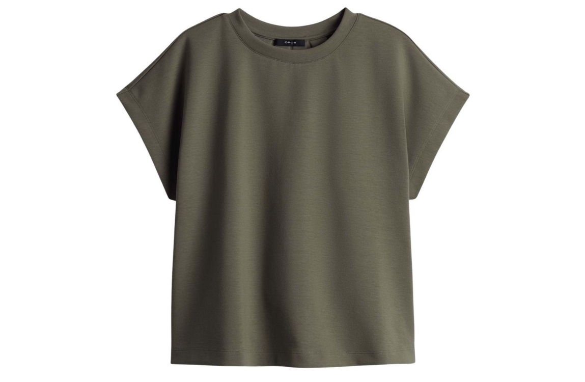Opus sweatshirt Ganne 10437413310100. Dit boxy fit model heeft een ronde hals en korte mouwen. Deze olijfkleurige sweatshirt van Opus is bewerkt met een fluweelachtig oppervlak en is afgewerkt met plooidetails op de rug.
