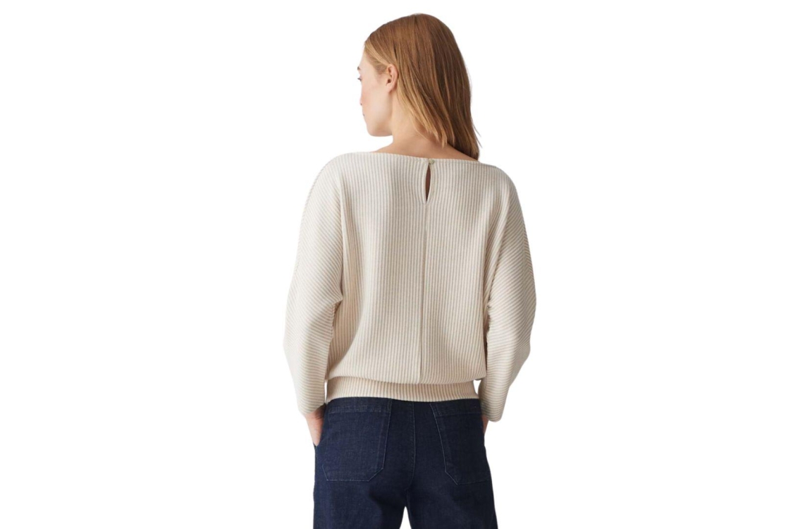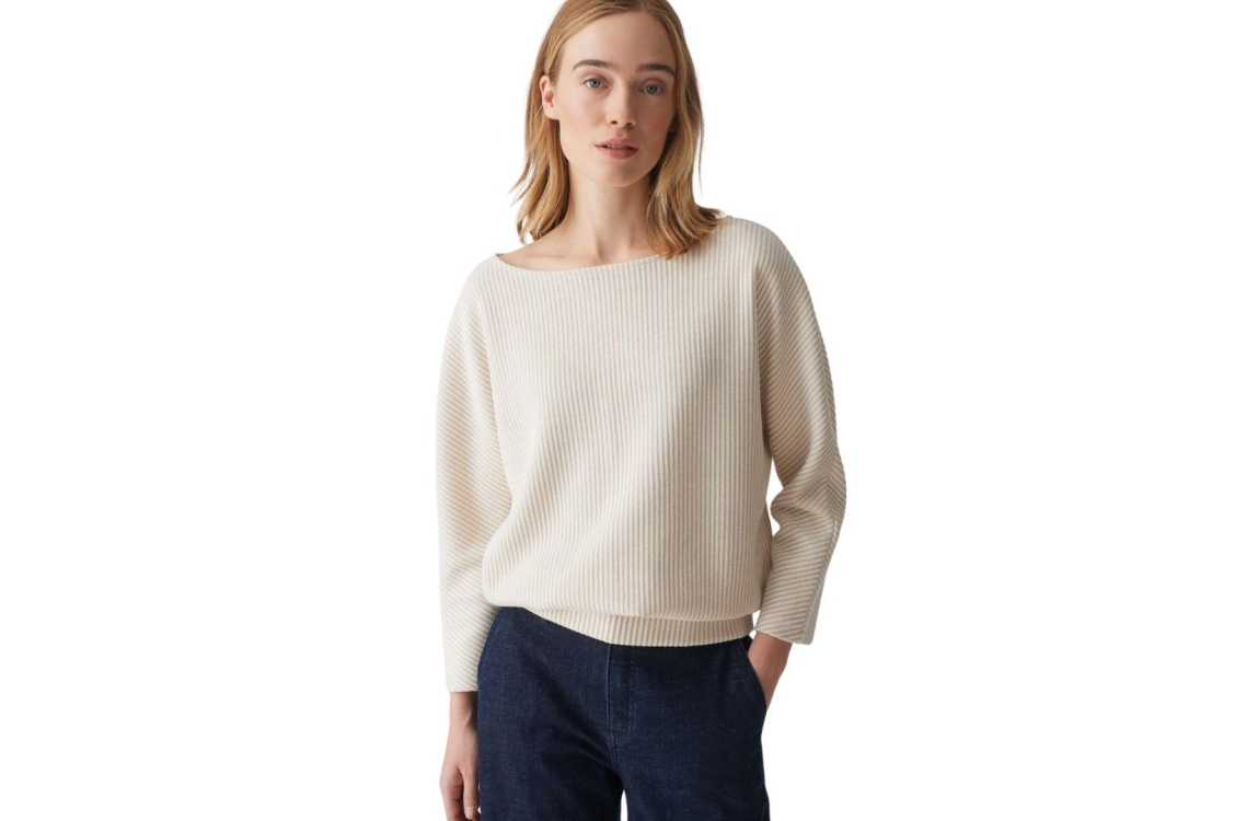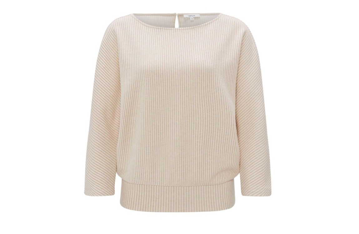Opus trui 10369012883100. Dit soepelvallend model is voorzien van een boothals en heeft lange vleermuis mouwen. Deze beige trui van Opus is bewerkt met een rib structuur.
