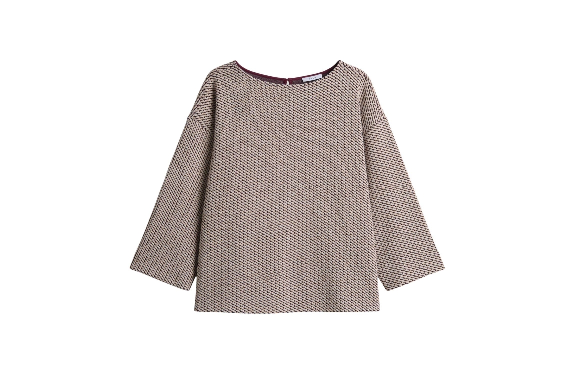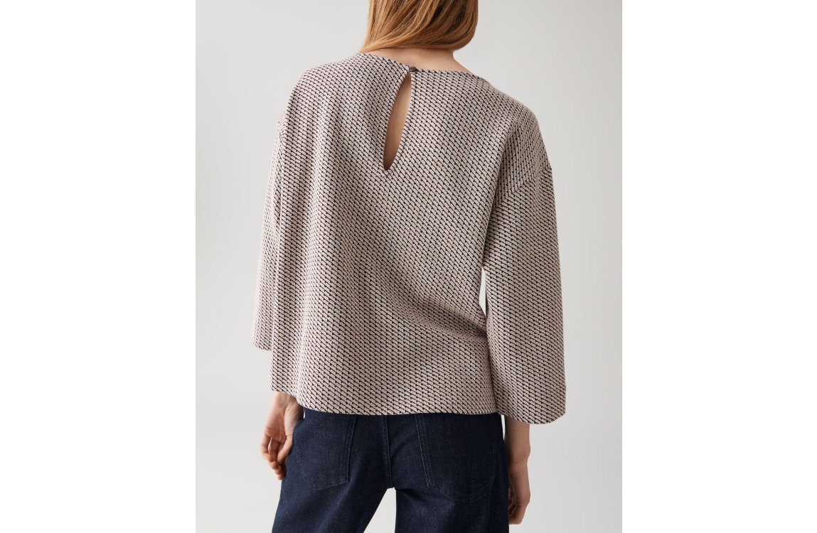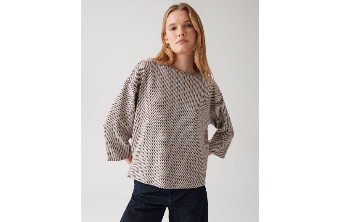 Opus Goman 40039 Dark grape. Dit wijdvallende model is voorzien van een ronde hals en driekwart mouwen. Deze paarse top van Opus is uitgevoerd in een tweekleurig patroon.