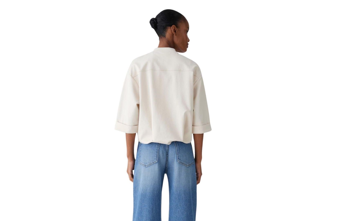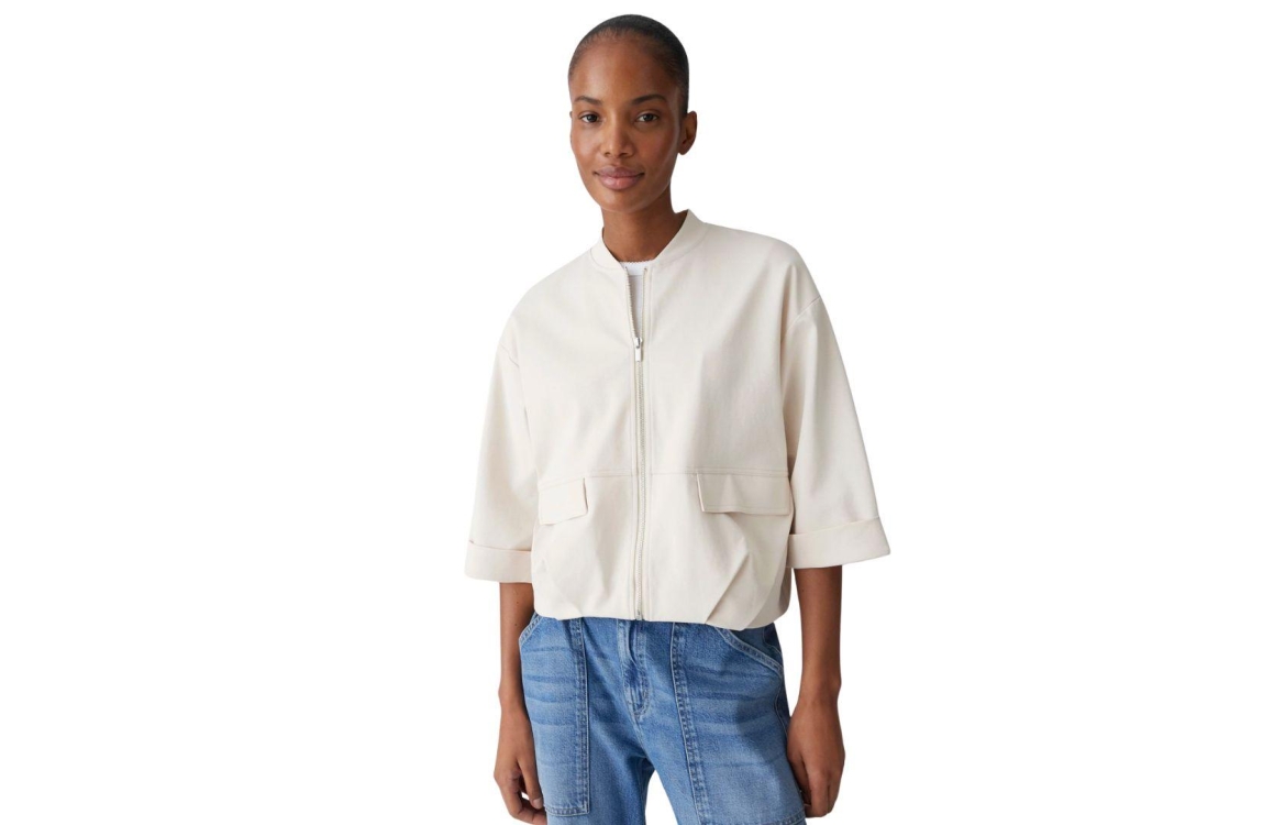 Opus vest 10536213995106 2003. Dit wijdvallende model heeft een blouson kraag met gedropte schouders en halve mouwen. Deze off-white/lichtbeige vest van Opus sluit aan de voorzijde door middel van een rits en is voorzien van twee klepzakken. Het model is afgewerkt met een elastische zoom, gedetailleerd met plooien.
