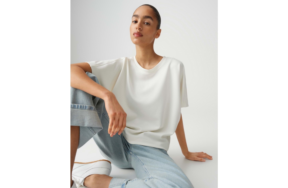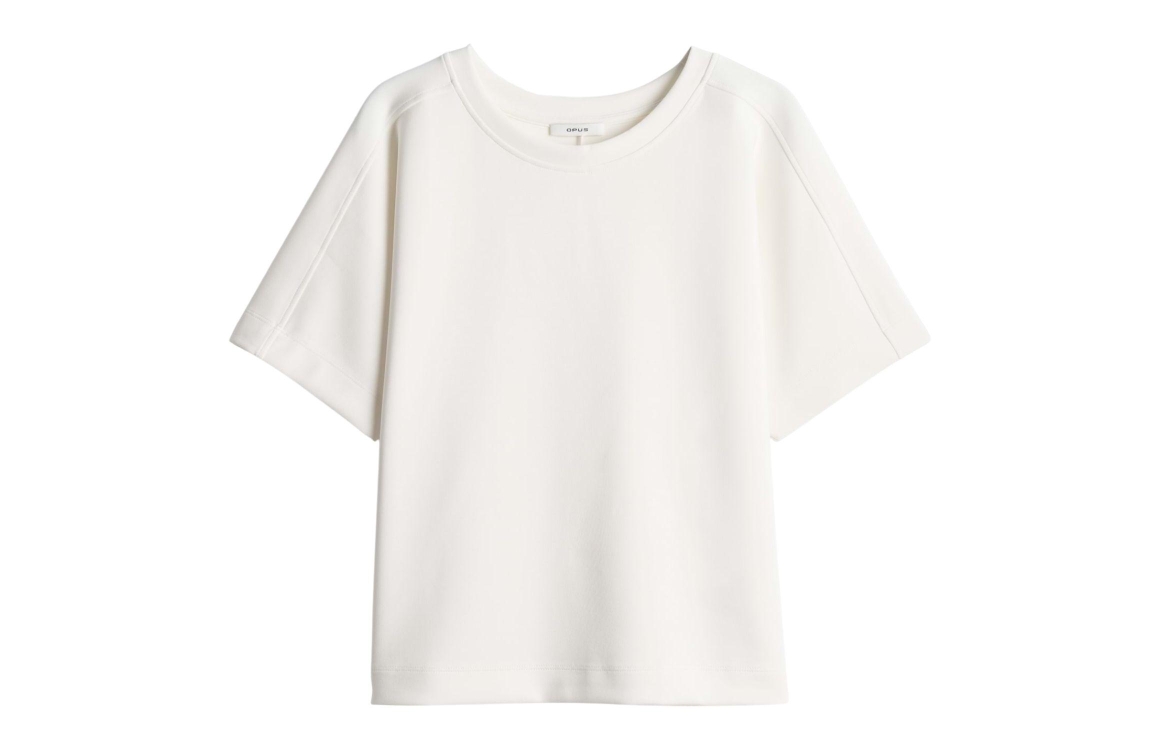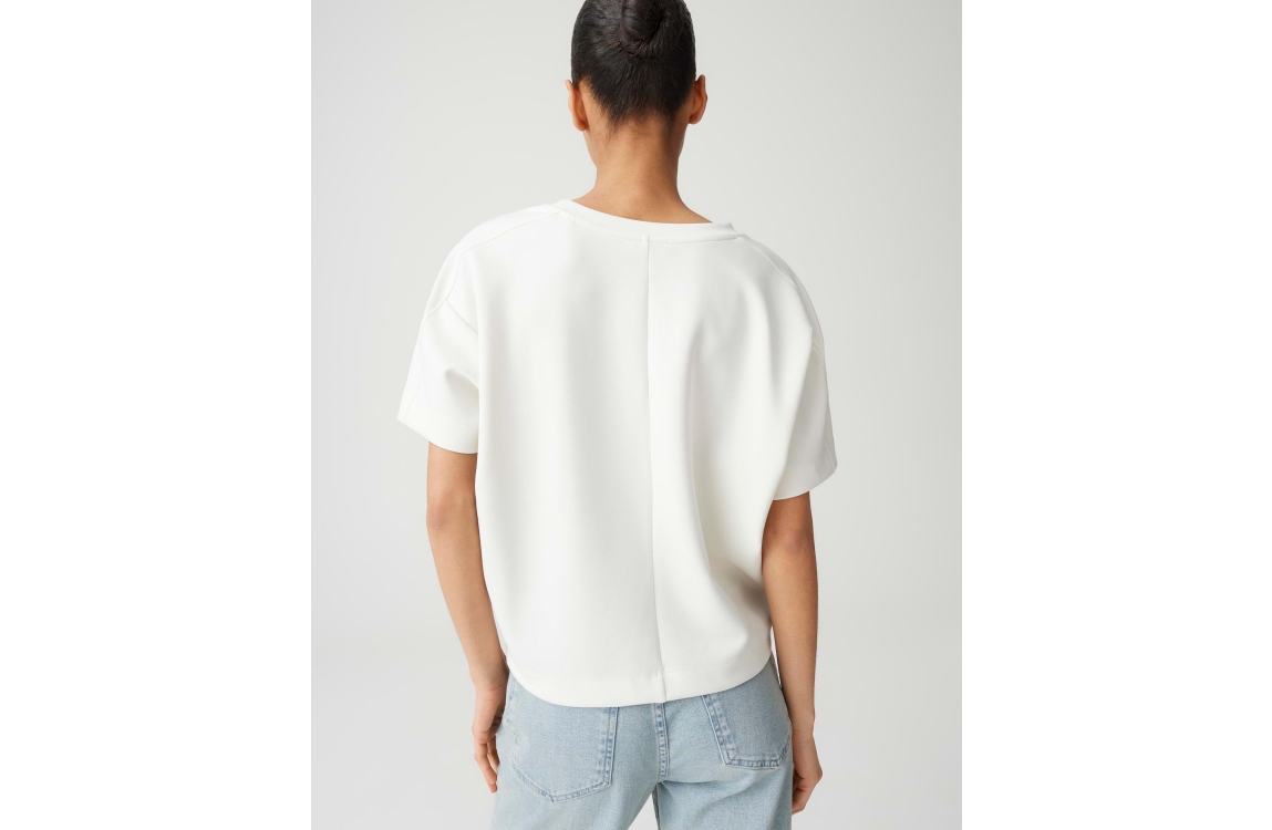 Opus Gosa 1004 Milk. Dit soepelvallende model is voorzien van een ronde hals en heeft korte vleermuismouwen. Dit witte sweatshirt van Opus is gemaakt van een zachte en licht elastische stof.