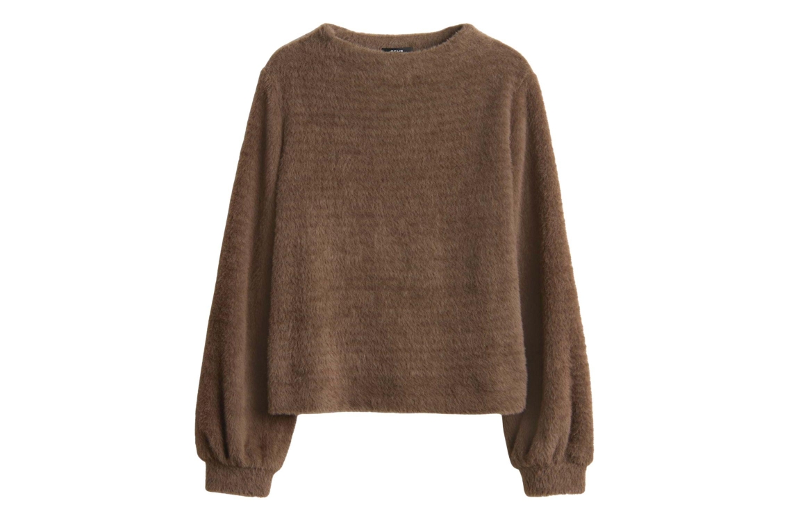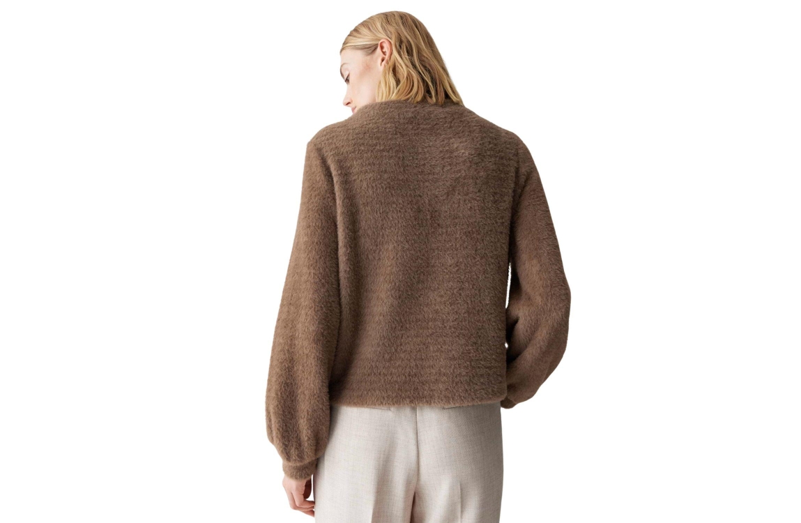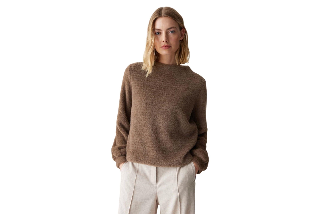 Opus trui 10473111771384 20020. Dit loose fit model heeft een trechterhals en lange mouwen met gedropte schouders. Deze bruine trui van Opus is uitgevoerd in fluffy-kwaliteit en elastische stof.