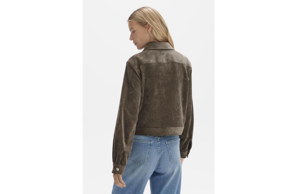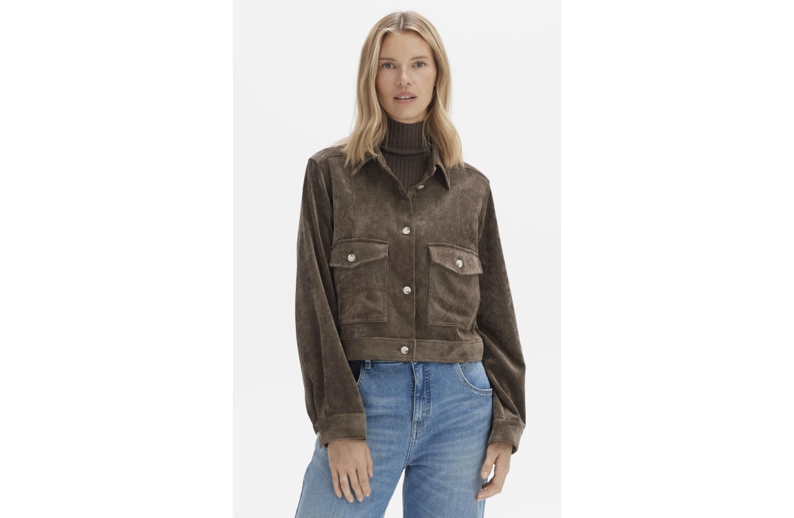 Opus jasje Hesani 1018955282. Dit korte model is voorzien van een kraag en heeft korte mouwen. Deze bruine corduroy jasje van Opus sluit door middel van knopen en beschikt over twee klepzakken aan de voorzijde.
