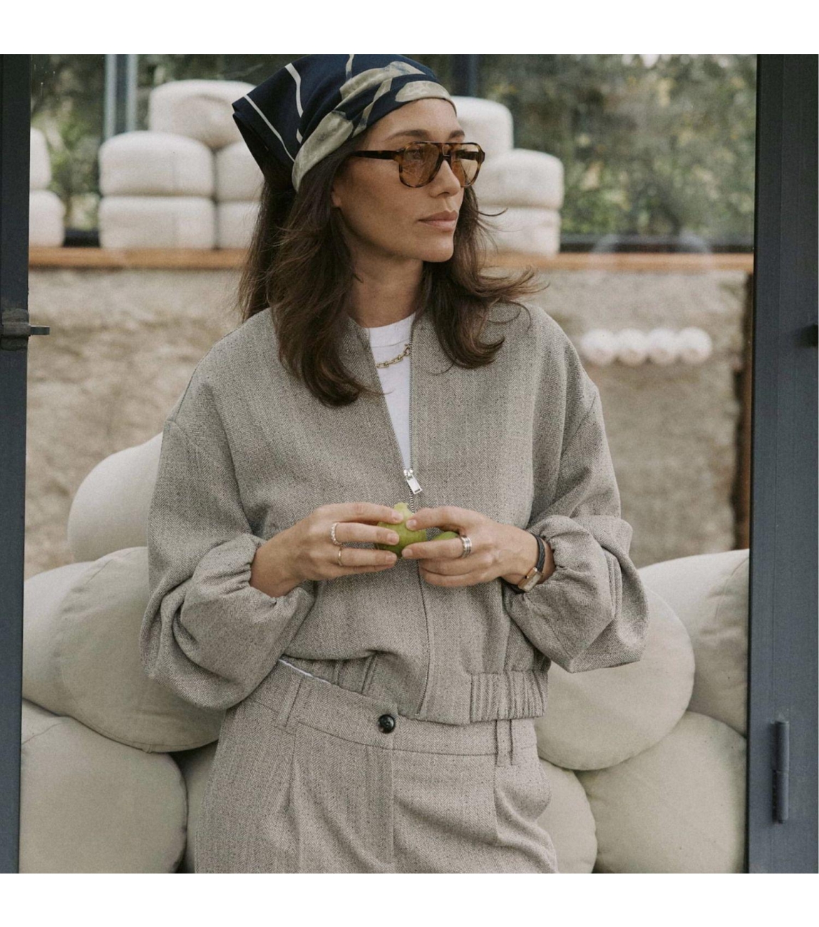 Opus jasje Jalea 10457813456376. Dit soepelvallende model heeft een blousonkraag en lange mouwen. Dit beige melange jasje van Opus sluit aan de voorzijde met een rits en is all-over bewerkt met een visgraatmotief. Het model heeft een verkorte lengte met gedropte schouders en is voorzien van schuine paspelzakken en een elastische zoom.