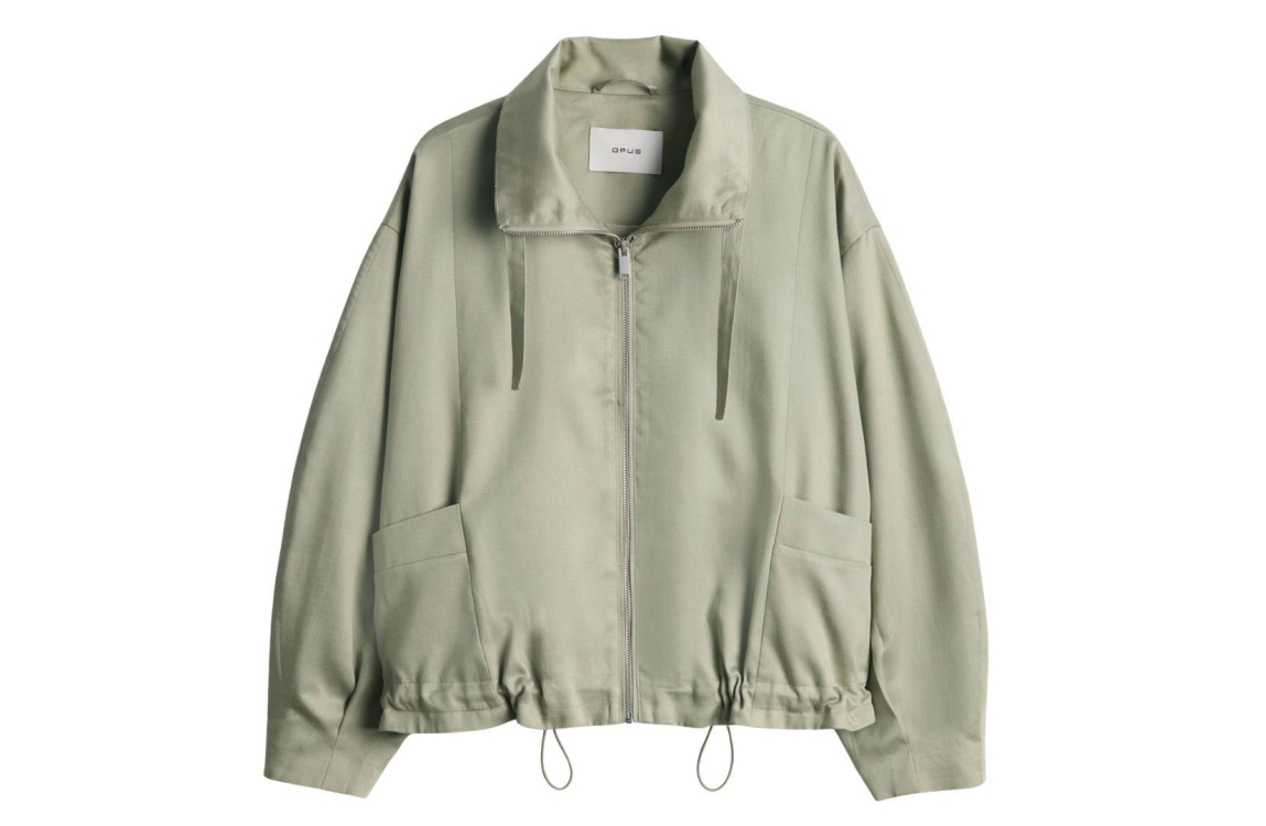 Opus jasje 10532913973418 30042. Dit oversized model heeft een kraag met gedropte schouders, trekkoord en lange ballonmouwen. Het olijfgroene jasje van Opus sluit aan de voorzijde door middel van een rits en is voorzien van twee opgestikte zakken. Het model beschikt over een zoom met trekkoord.
