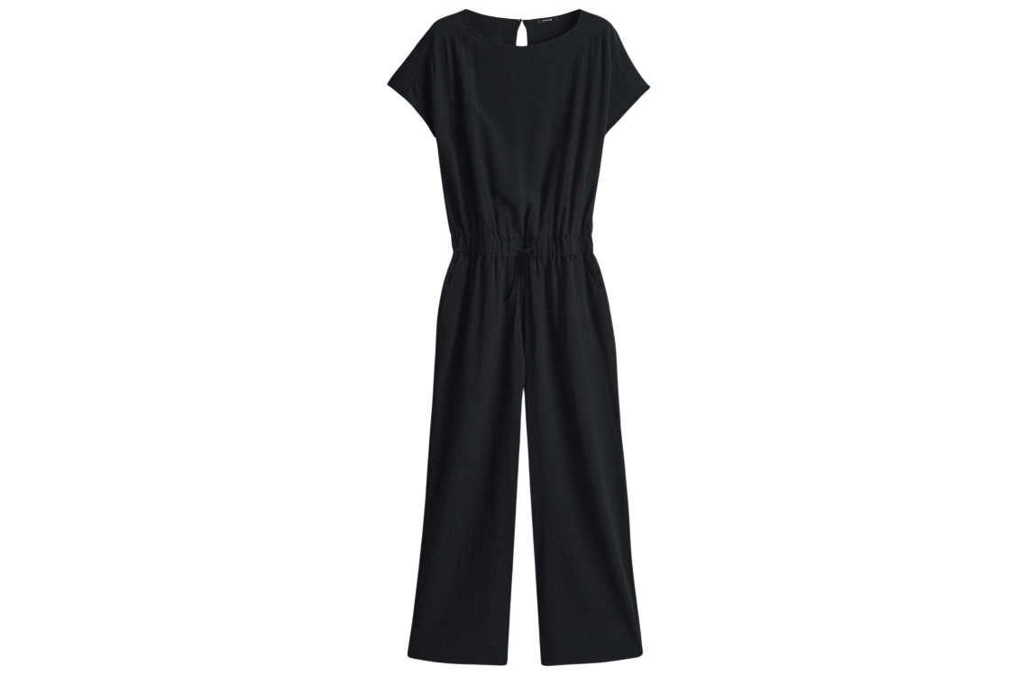 Opus jumpsuit Mabuzi 10420611507. Dit soepelvallend model heeft een onderzeese halslijn en overgesneden korte mouwen. Deze zwarte jumpsuit van Opus is uitgevoerd in een geweven stof met een seersucker structuur. Het model heeft schuine steekzakken en een elastische tailleband met trekkoord.