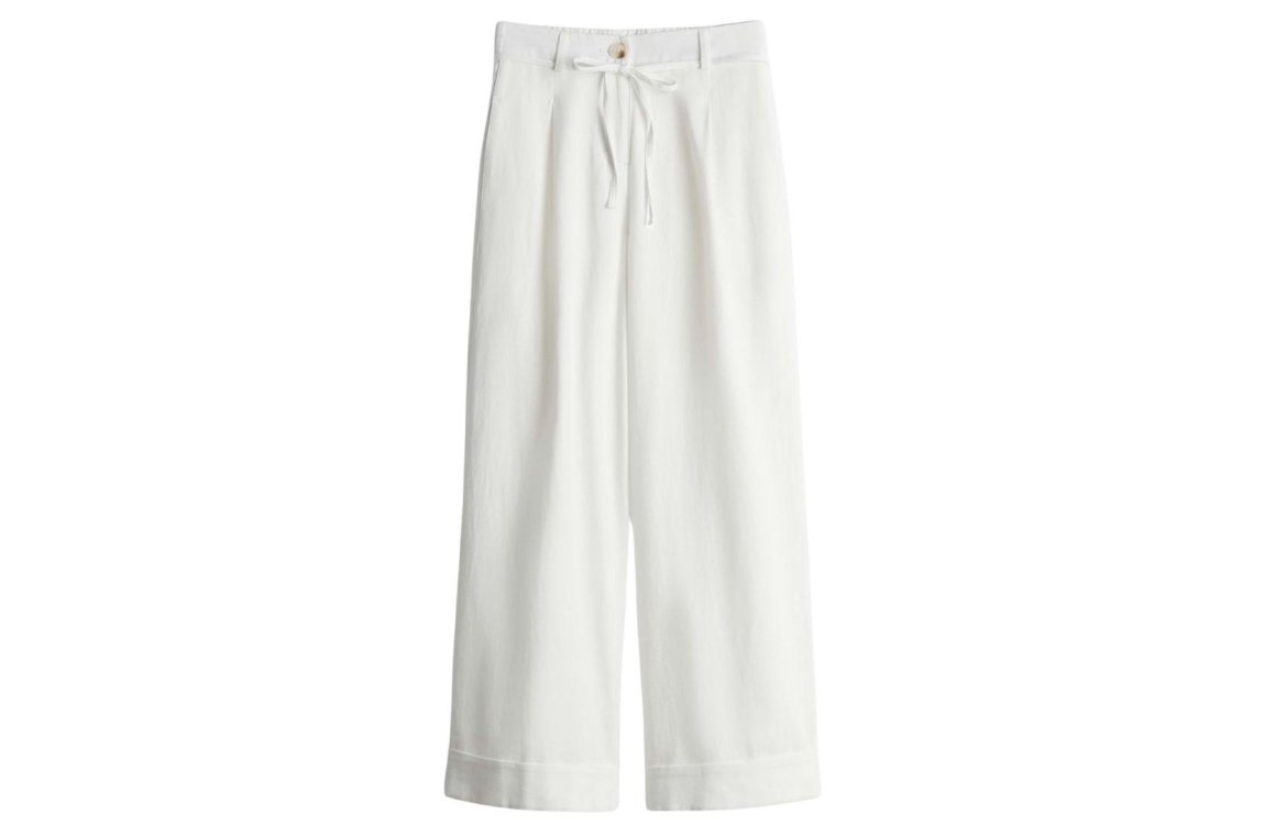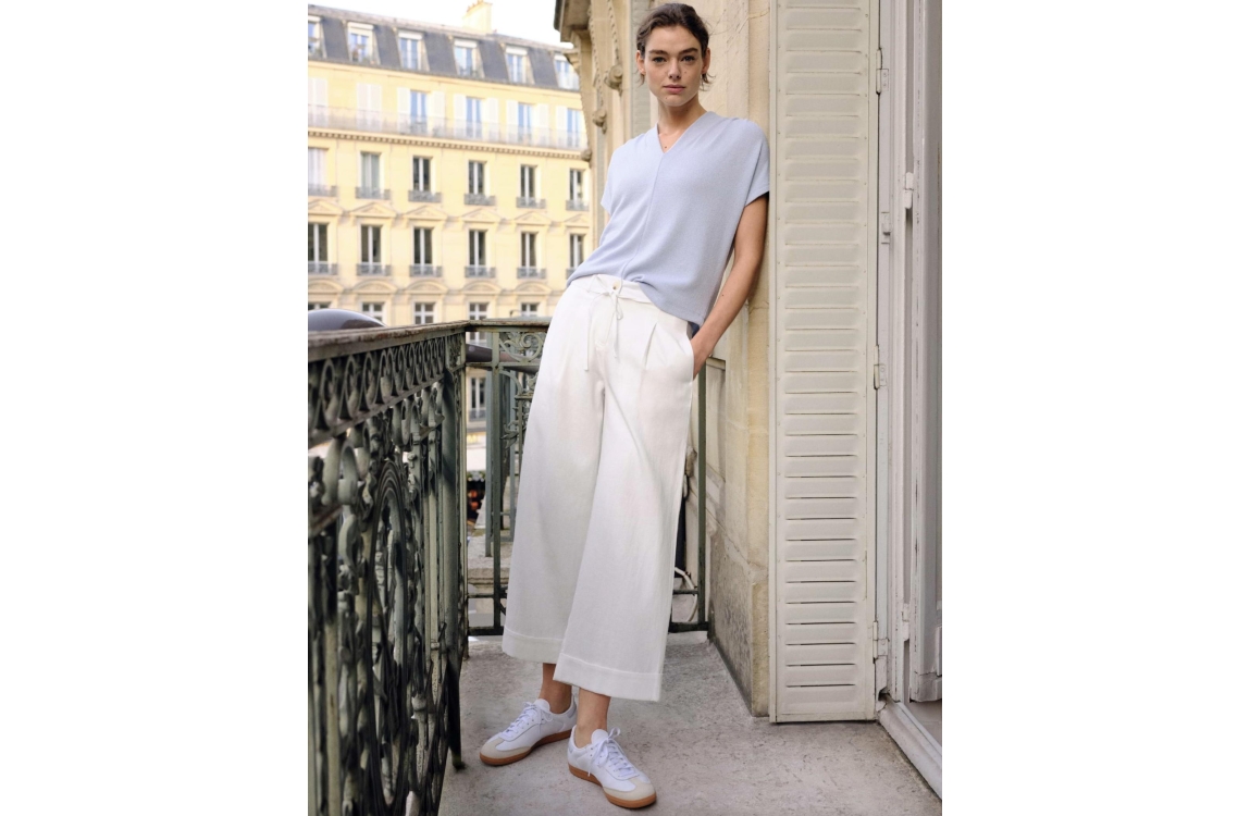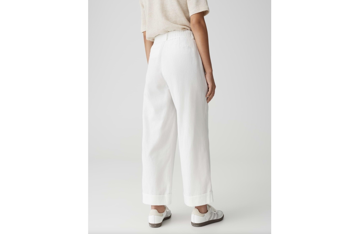 Opus kleding broek Meeri french 10400013064. Dit wide fit model sluit door middel van een knoop en rits en is voorzien van een koord. Deze witte broek van Opus beschikt over twee steekzakken aan de voorzijde en twee paspelzakken aan de achterzijde. Dit model is uitgevoerd in een geweven stof en heeft een omslag op de zoom.