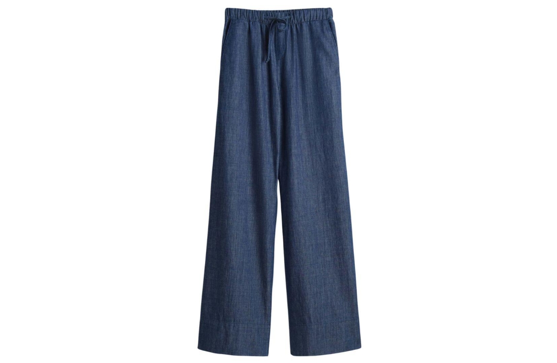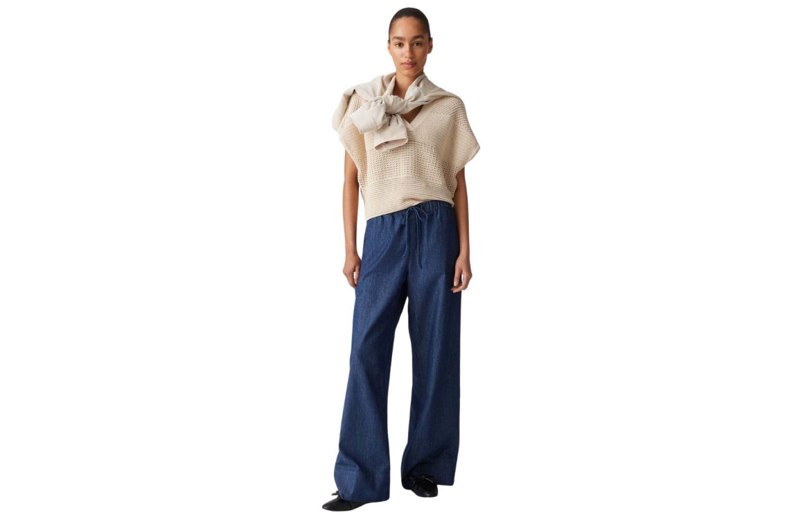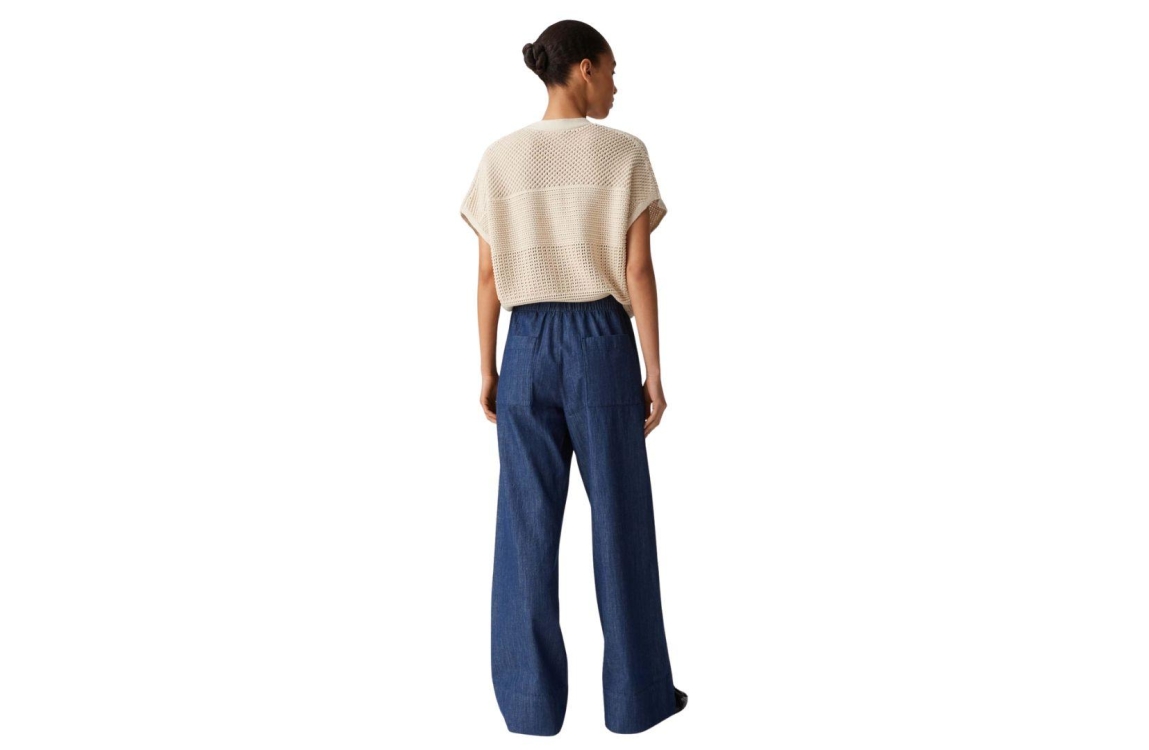 Opus broek Melane denim 10441013341366. Dit wide fit model met rechte been sluit door middel van een elastische boord met trekkoord. Deze donkere denim broek van Opus is voorzien van twee steekzakken aan de voor- en achterzijde.