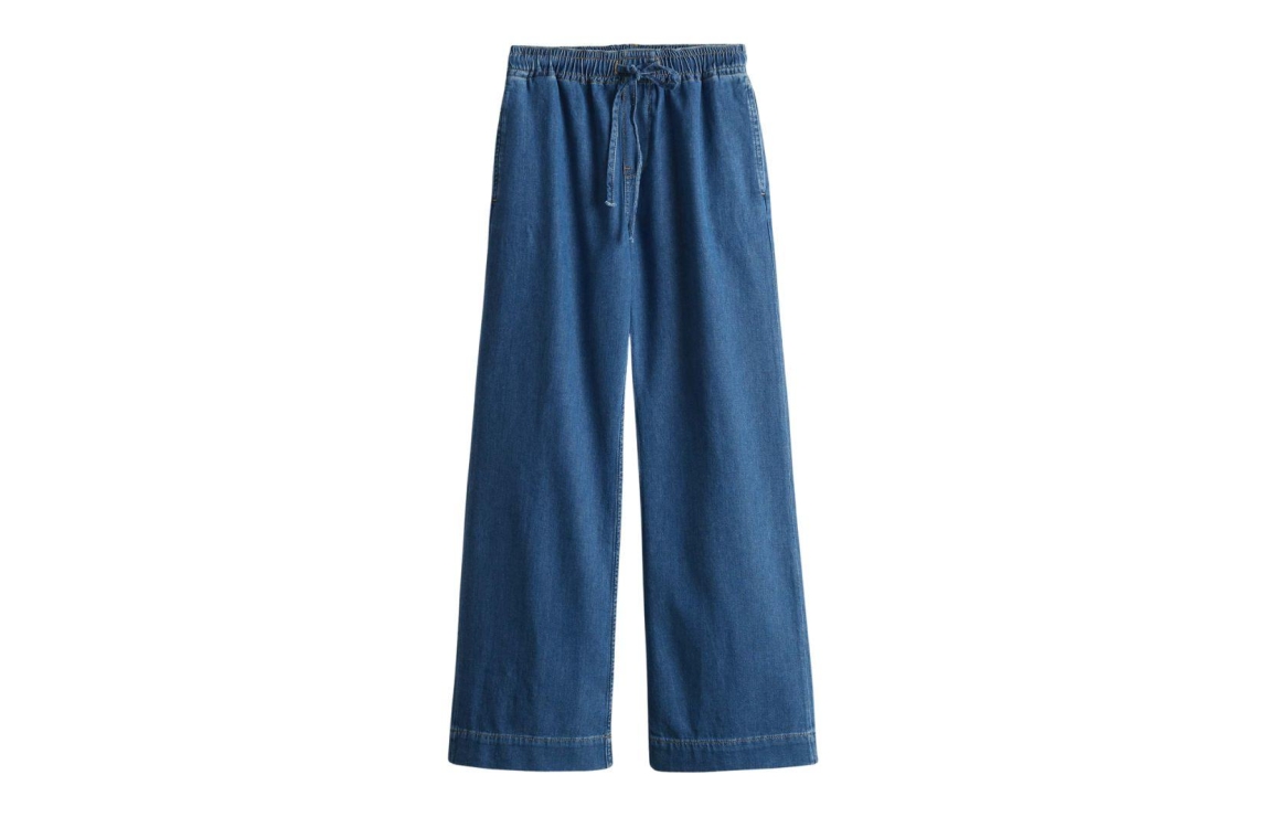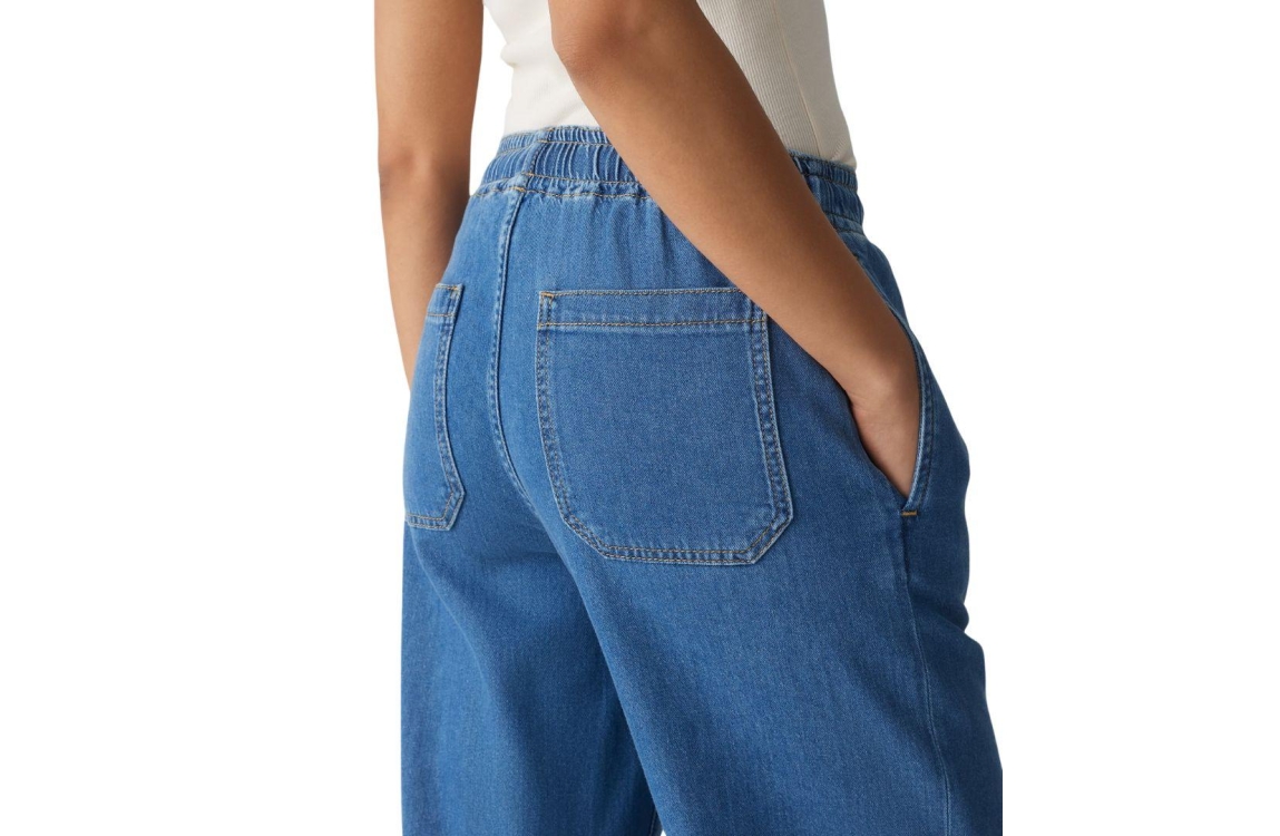 Opus broek 10387512978100. Dit wide leg model sluit door middel van elastische boord met trekkoorden. Deze blauwe denim broek van Opus is voorzien van twee steekzakken aan de voor- en achterzijde.