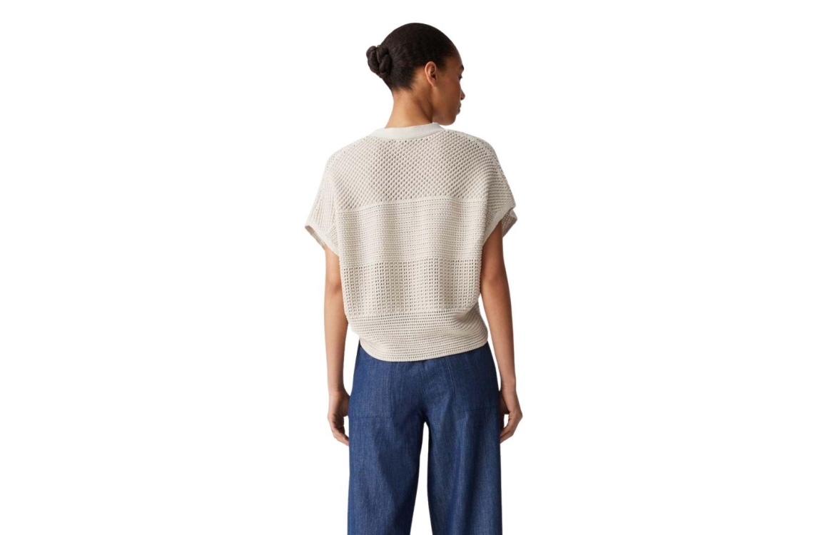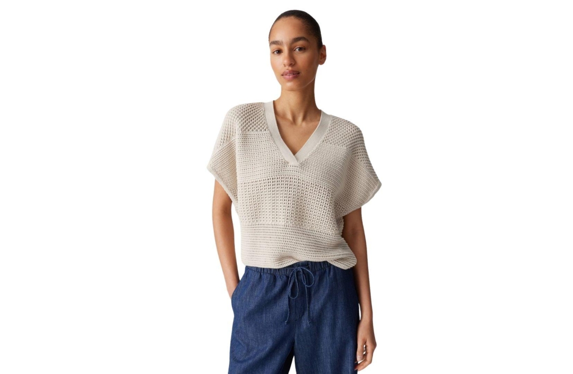 Opus trui 10437113312366. Dit soepelvallend model is voorzien van een V-hals en heeft korte kapmouwen. Deze beige trui van Opus is gebreid uitgevoerd.