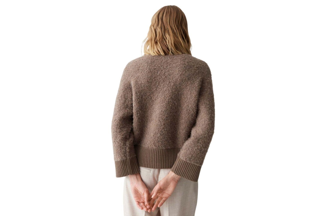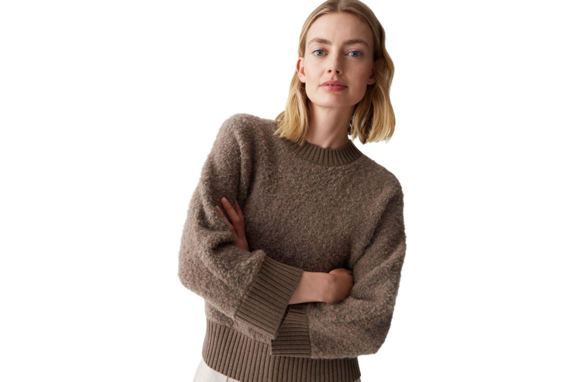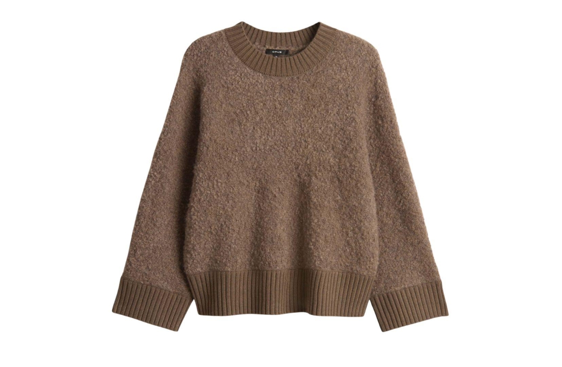 Opus trui Pennan 1047464869100 20020. Dit rechtvallende model heeft een ronde halslijn en lange mouwen. Deze bruine trui van Opus is uitgevoerd in een grove breisel met boucléstructuur en is afgewerkt met ribgebreide boorden.