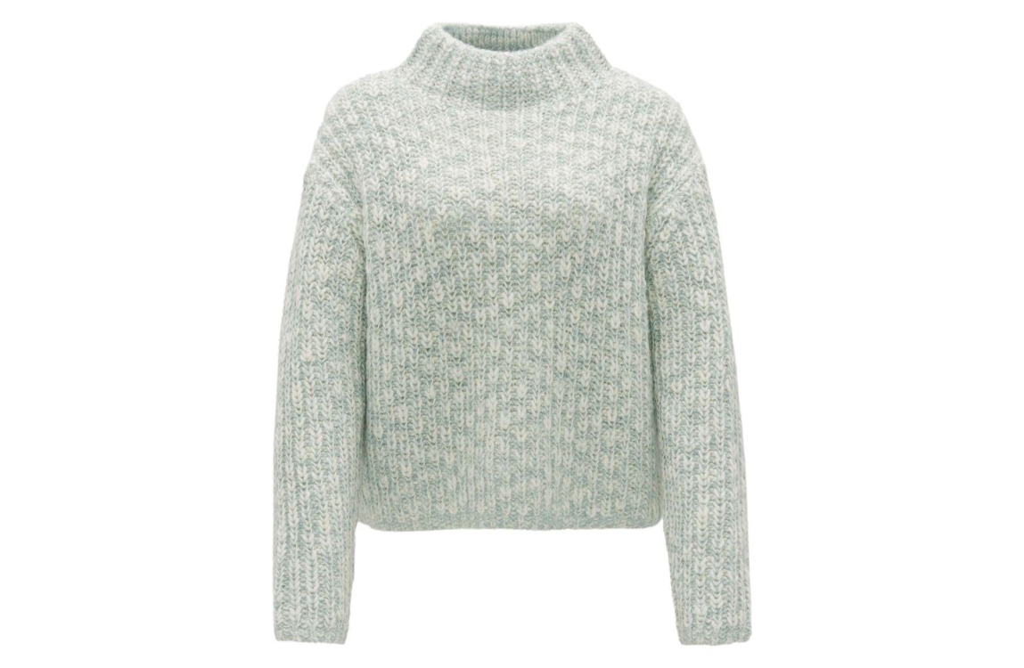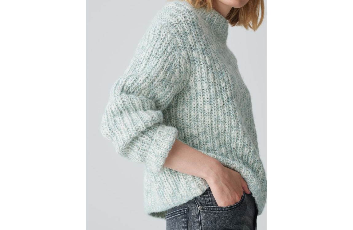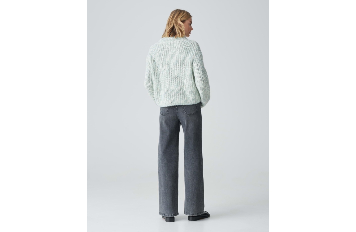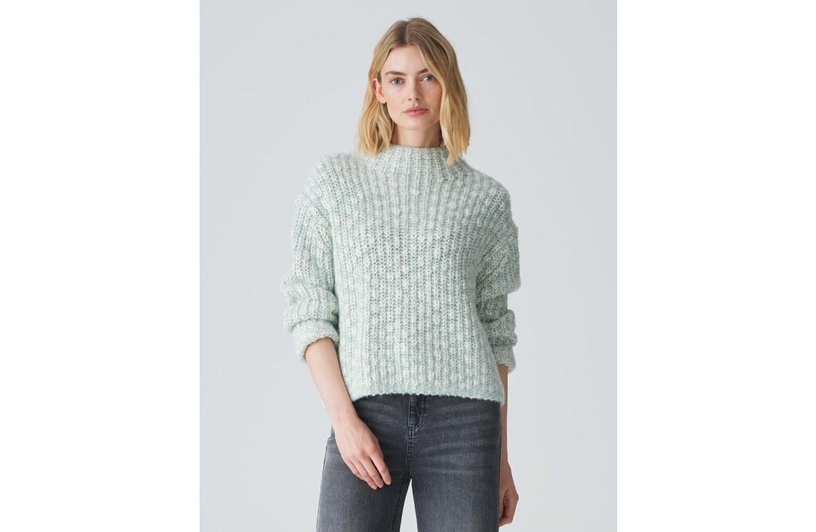 Opus kleding trui Perke 10332512602. Dit rechtvallend model heeft een hoog opstaande kraag en lange mouwen. Deze blauwe trui van Opus is uitgevoerd in een grof breisel en heeft een pluizig oppervlak.