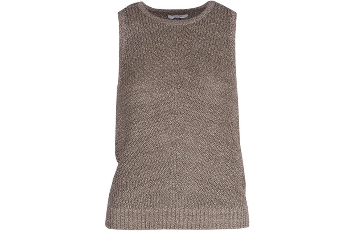OPUS top 10284112261258. Dit rechtvallende model heeft een ronde hals en heeft geen mouwen. Dit bruine Opus van OPUS is bewerkt met een glitter.
