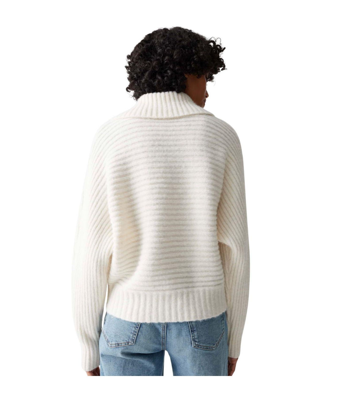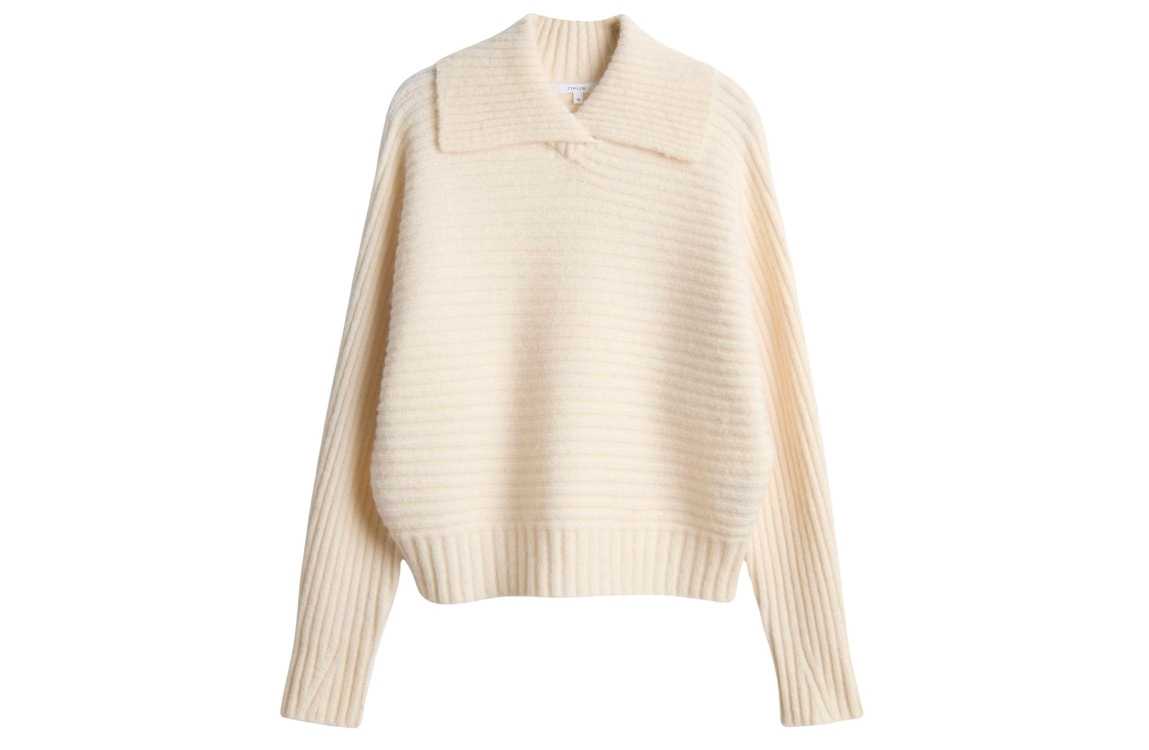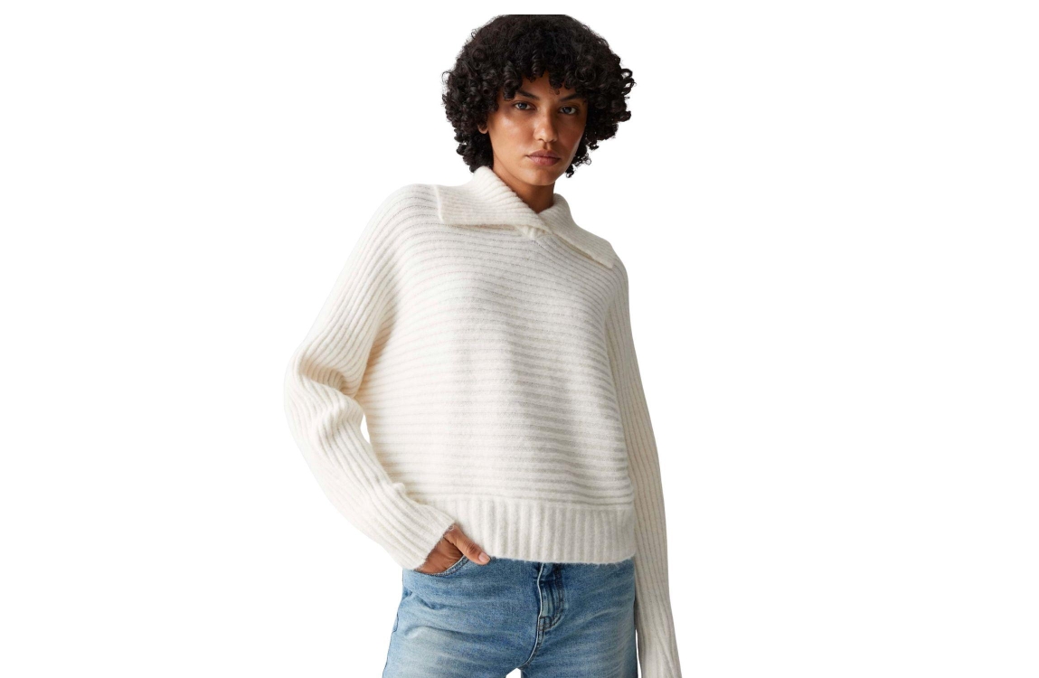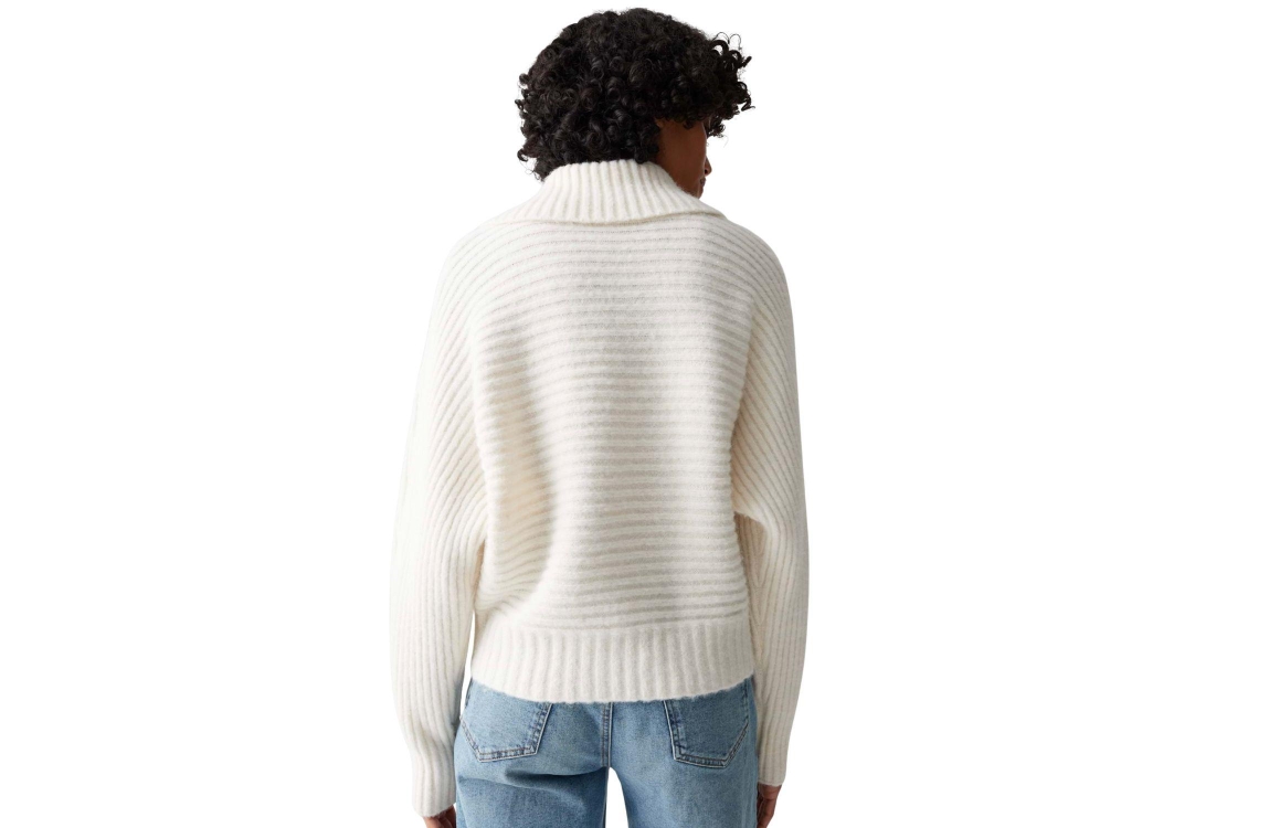 Opus trui 10474210962384 56411. Dit soepelvallende model heeft een col met splitdetail en lange mouwen. Deze creamkleurige trui van Opus is uitgevoerd in ribgebreide stof en heeft afgewerkte boorden.