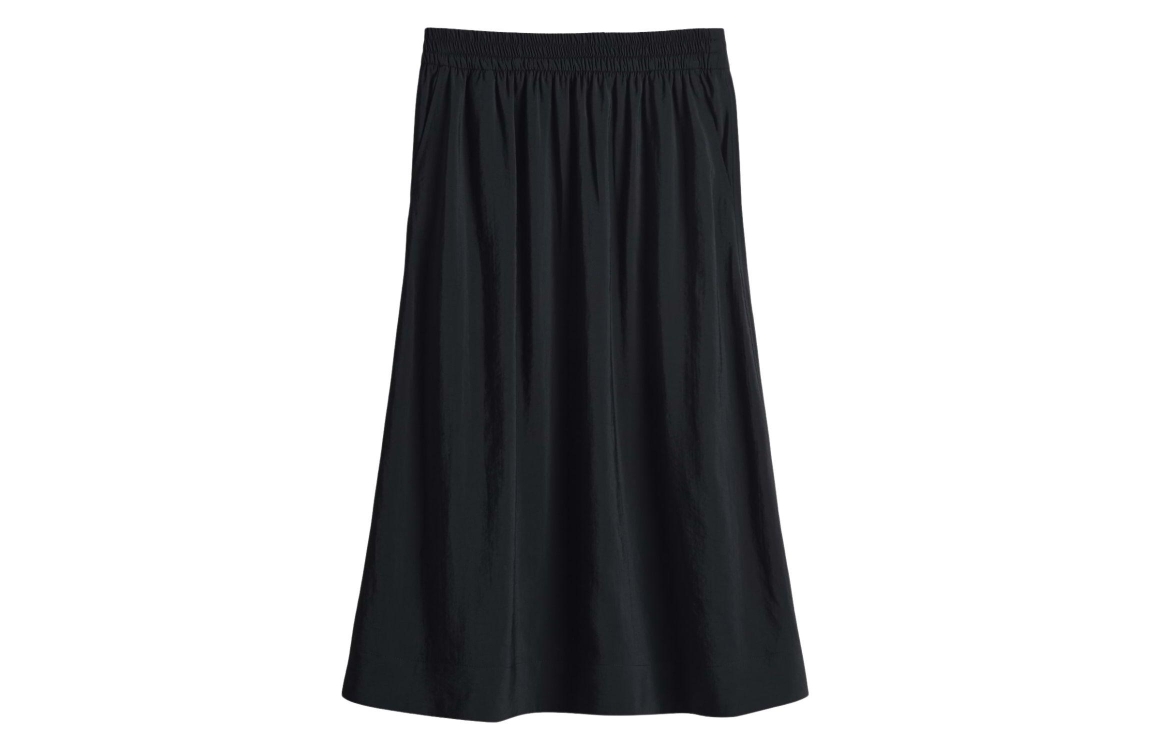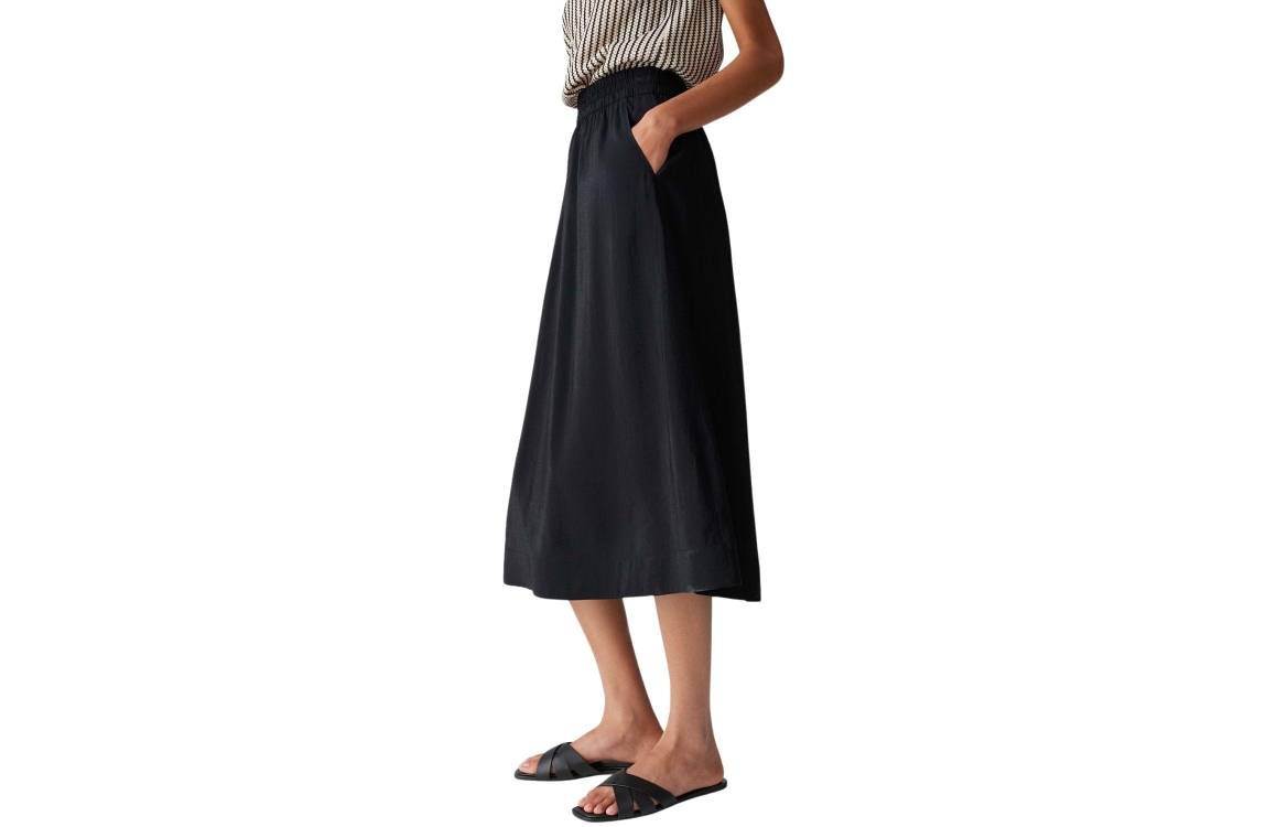 Opus rok Ronella 10427113201. Dit soepelvallend model sluit door middel van een brede en elastische tailleband. Deze zwarte rok van Opus is uitgevoerd in geweven stof en heeft een matte glans op het oppervlak. Het model beschikt over twee schuine steekzakken en is afgewerkt met een gestikte scheidingsnaad aan de achterzijde.