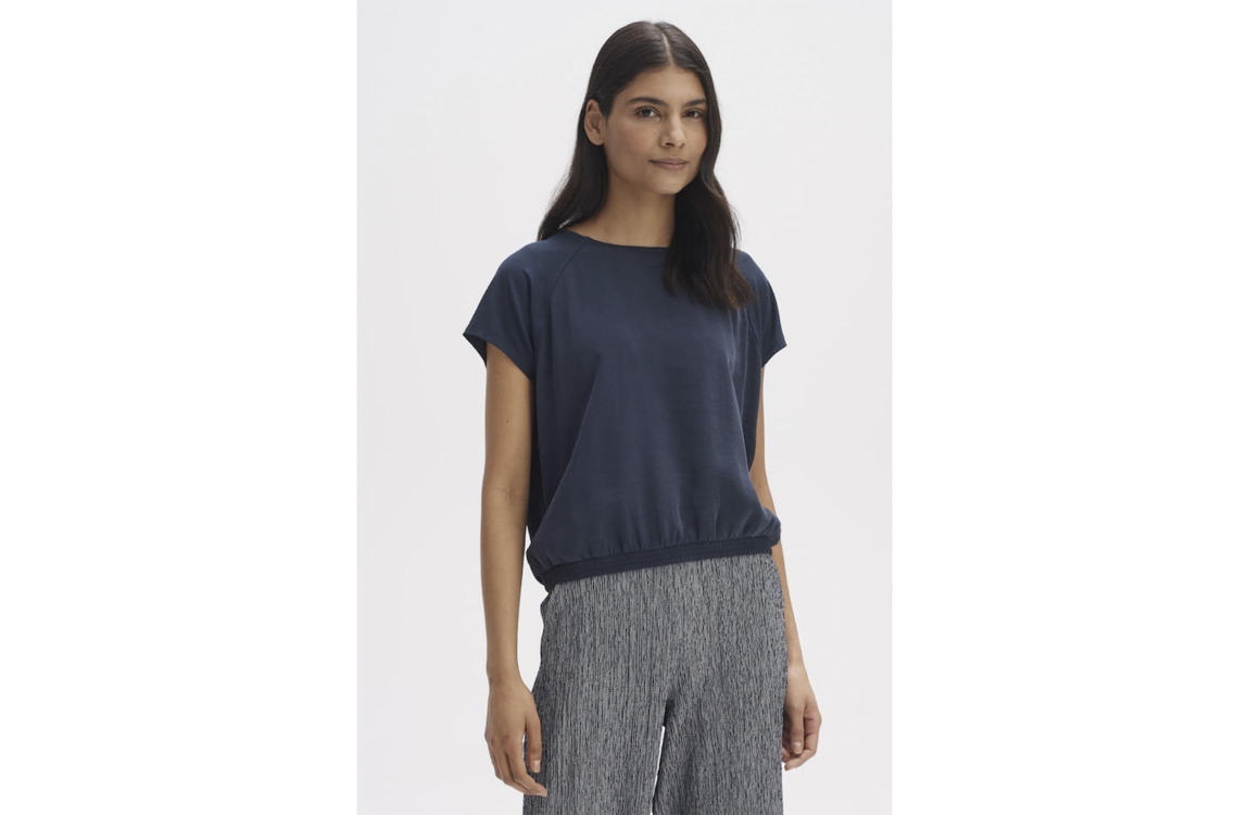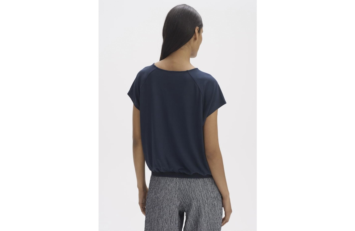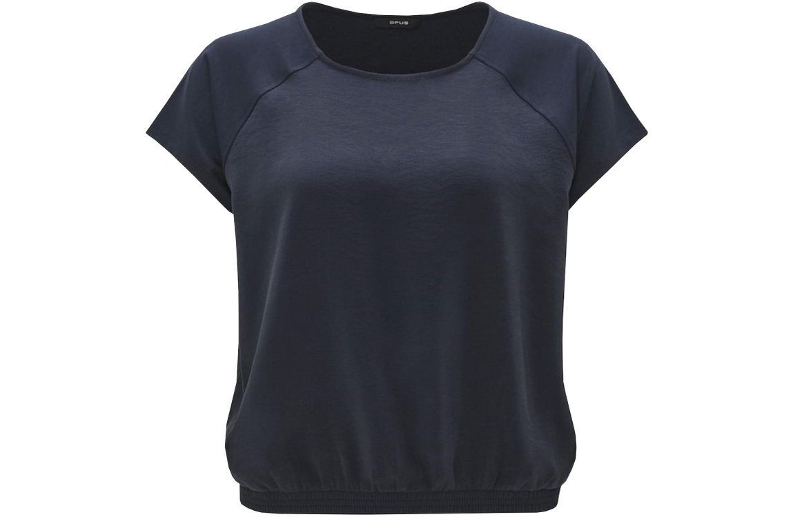 Opus shirt Sagama 1028739422258. Dit losvallend model is voorzien van een ronde hals en heeft korte mouwen. Deze donkerblauwe shirt van Opus is afgewerkt met een elastische boord aan de onderzijde.