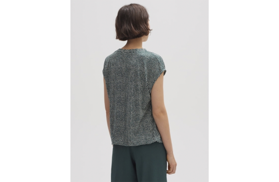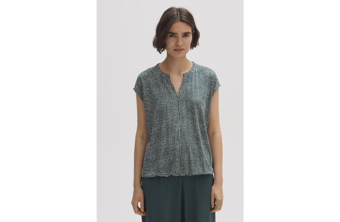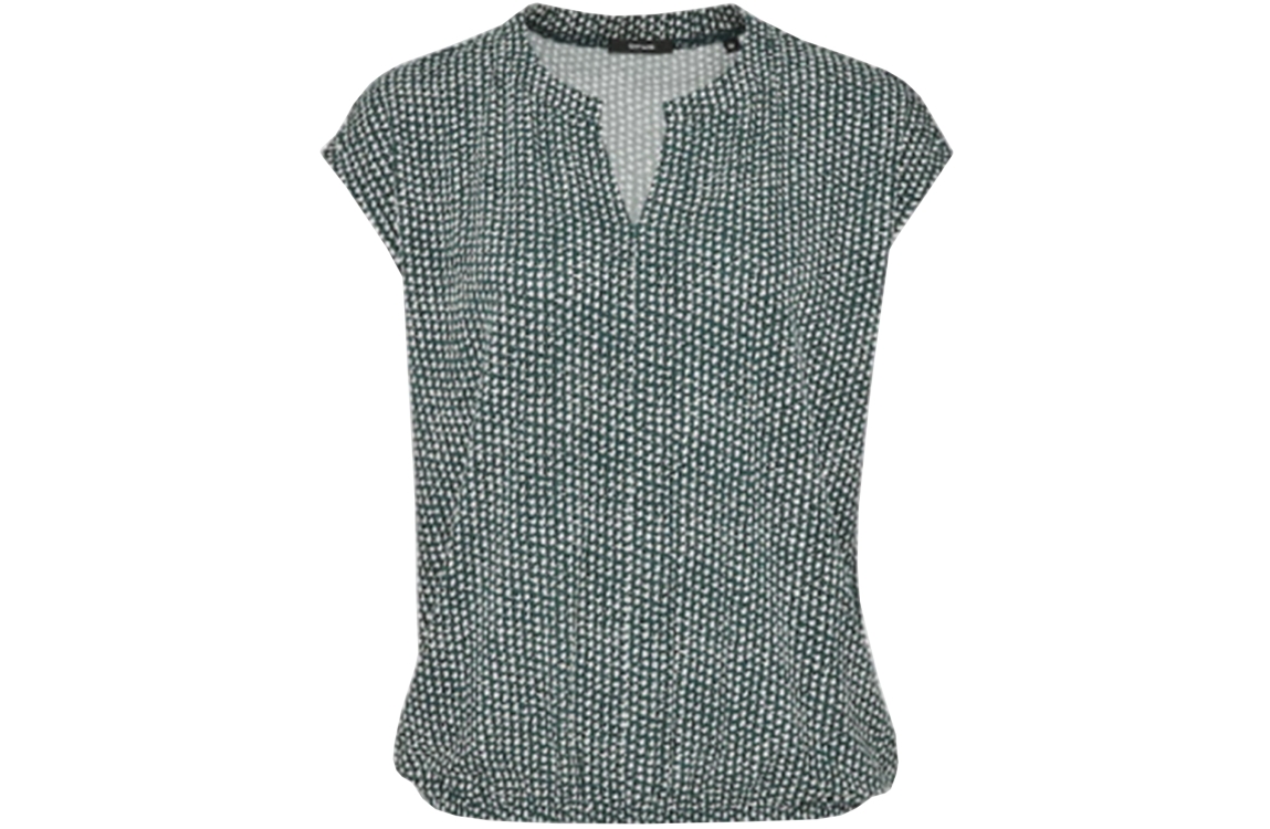 Opus top Sandeo blob 2411011421. Dit rechtvallend model is voorzien van een ronde hals met v-inkeping en heeft korte mouwen. Deze groene top van Opus is bewerkt met een witte all-over print en is aan de onderzijde afgewerkt met een elastische boord.