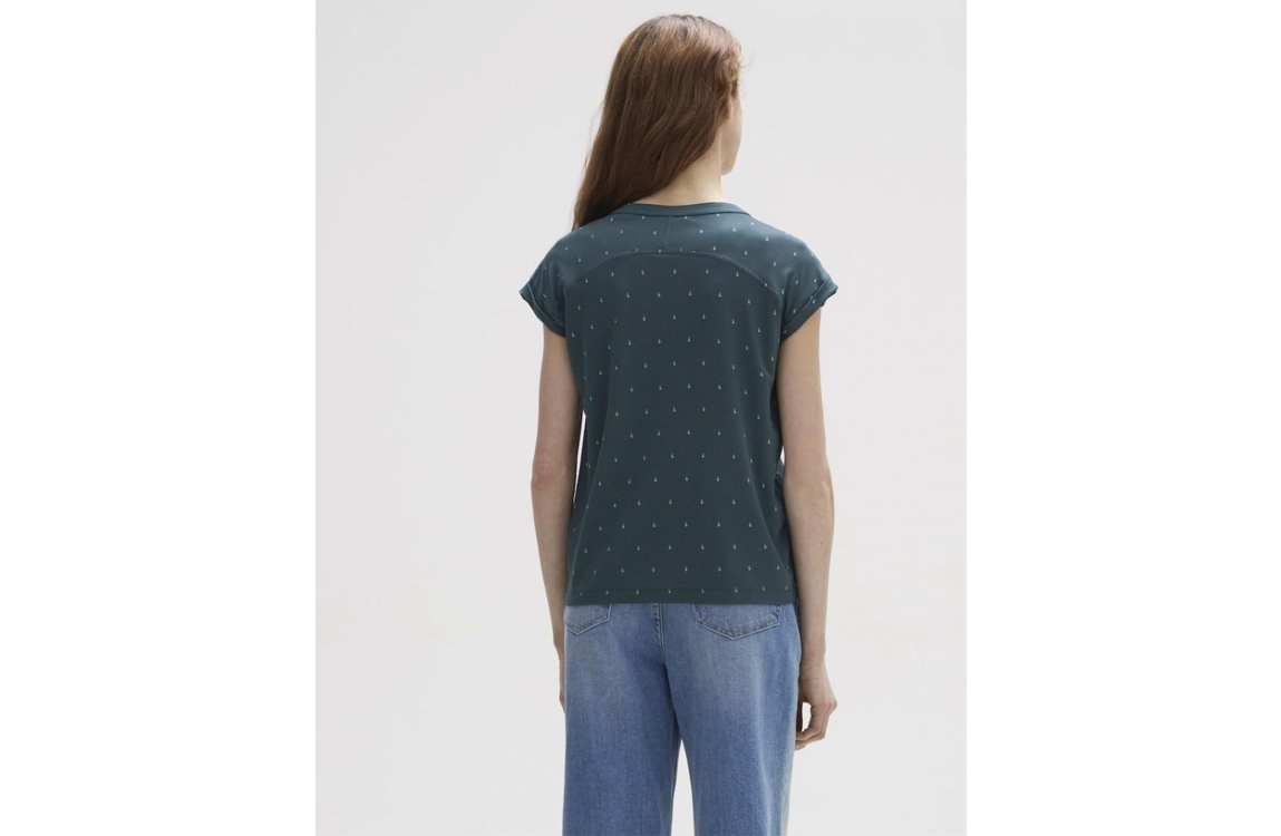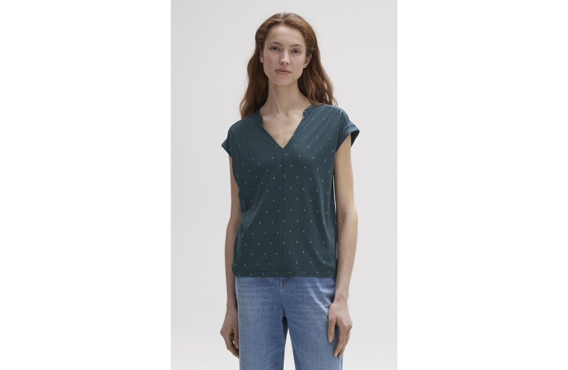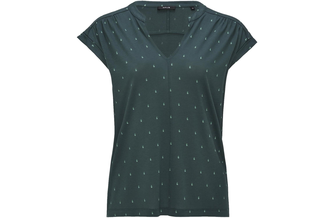 Opus shirt Sandi dotsy 2260111543. Dit rechtvallend model is voorzien van een ronde hals met v-inkeping en heeft korte overgesneden mouwen afgewerkt met plooidetails. Deze donkergroene shirt van Opus is all-over bewerkt met een subtiele stippen print en beschikt aan de achterzijde over een rugjuk.