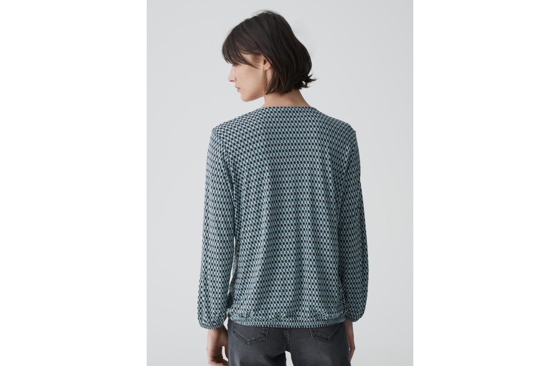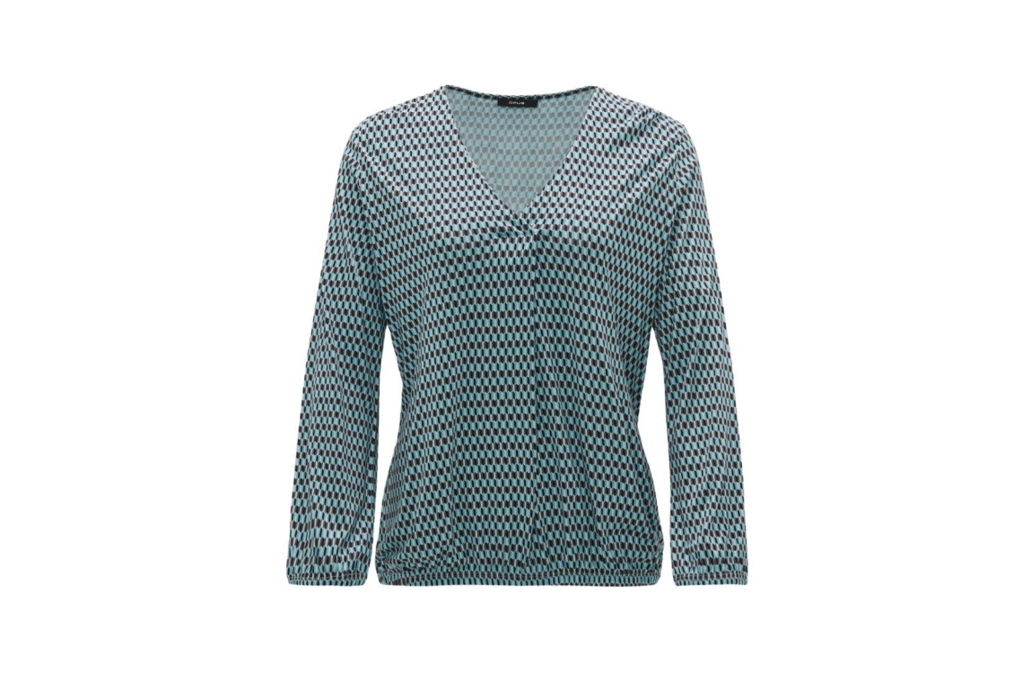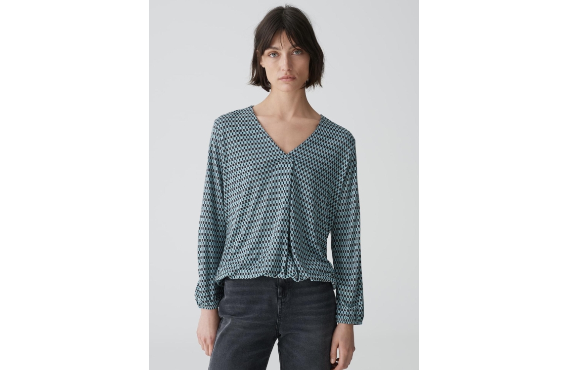 Opus kleding top Sannah Tradition 10320112510. Dit losvallend model heeft een V-hals en lange mouwen. Deze blauwe top van Opus is all-over bewerkt met een grafische print in verschillende kleuren en is afgewerkt met elastische boorden aan de onderzijde en mouwen.