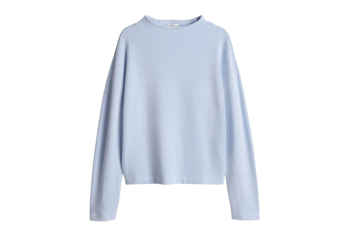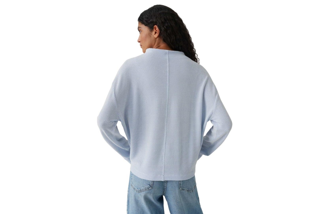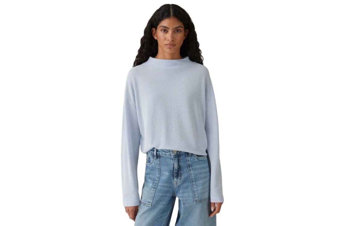 Opus shirt Serata 10521412055106. Dit rechtvallend model is voorzien van een hoge ronde hals en heeft lange mouwen. Dit blauwe shirt van Opus is bewerkt met een witte structuur.