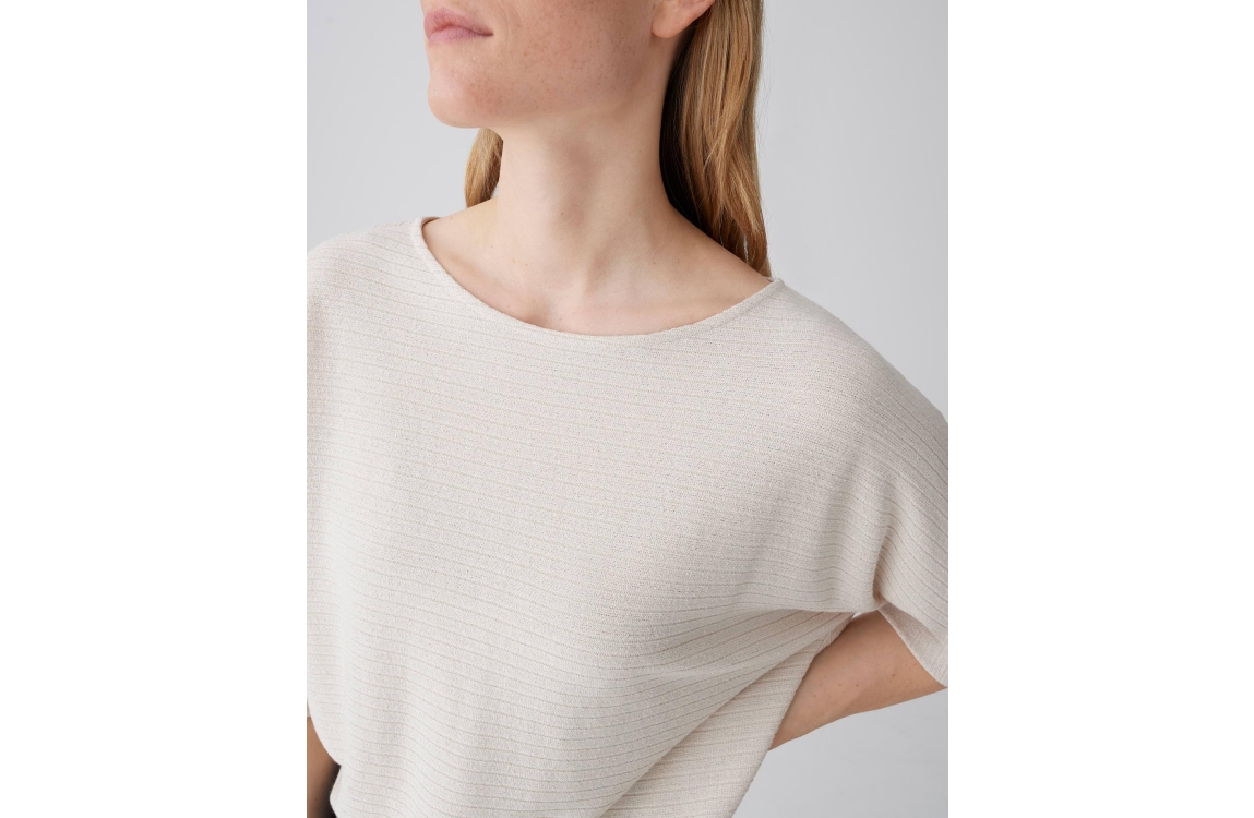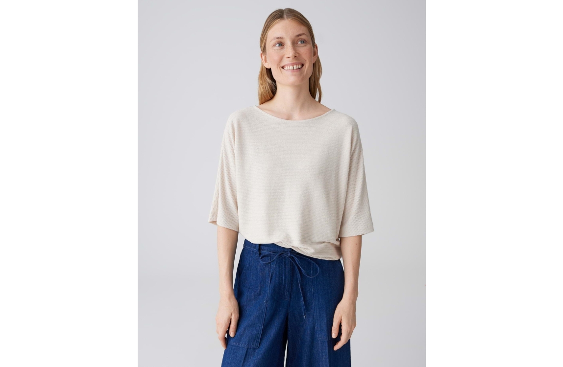 Opus Serifos 10537614004418 top. Dit soepelvallend model heeft een ronde hals en driekwart mouwen. Deze beige top van Opus is bewerkt met horizontale strepen en uitgevoerd in een licht materiaal.