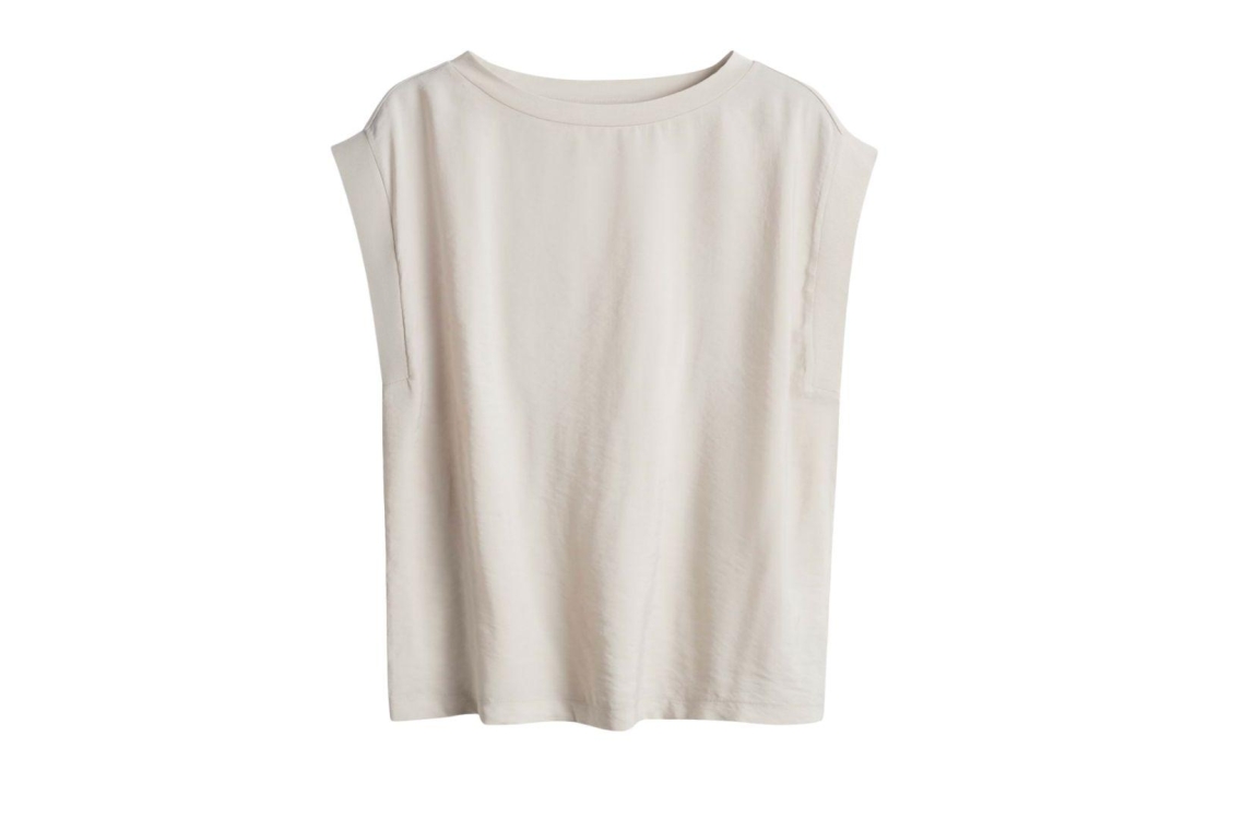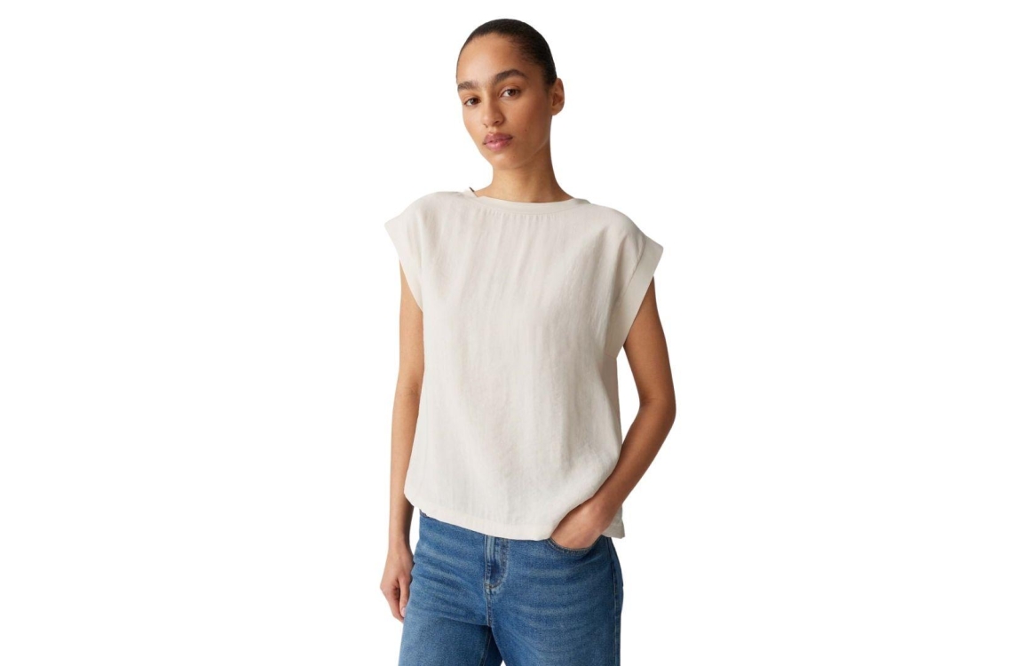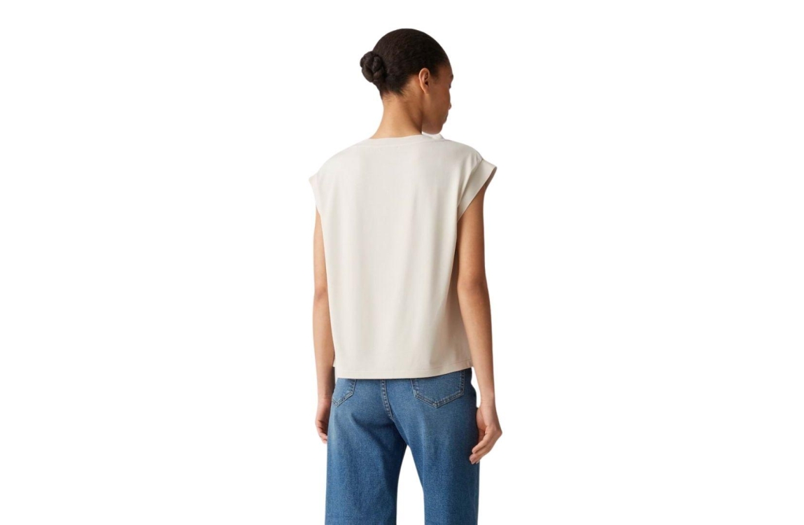 Opus shirt 10443912924100. Dit rechtvallend model is voorzien van een ronde hals en heeft korte mouwen. Deze naturel kleurige shirt van Opus is uitgevoerd in een mix van materialen.