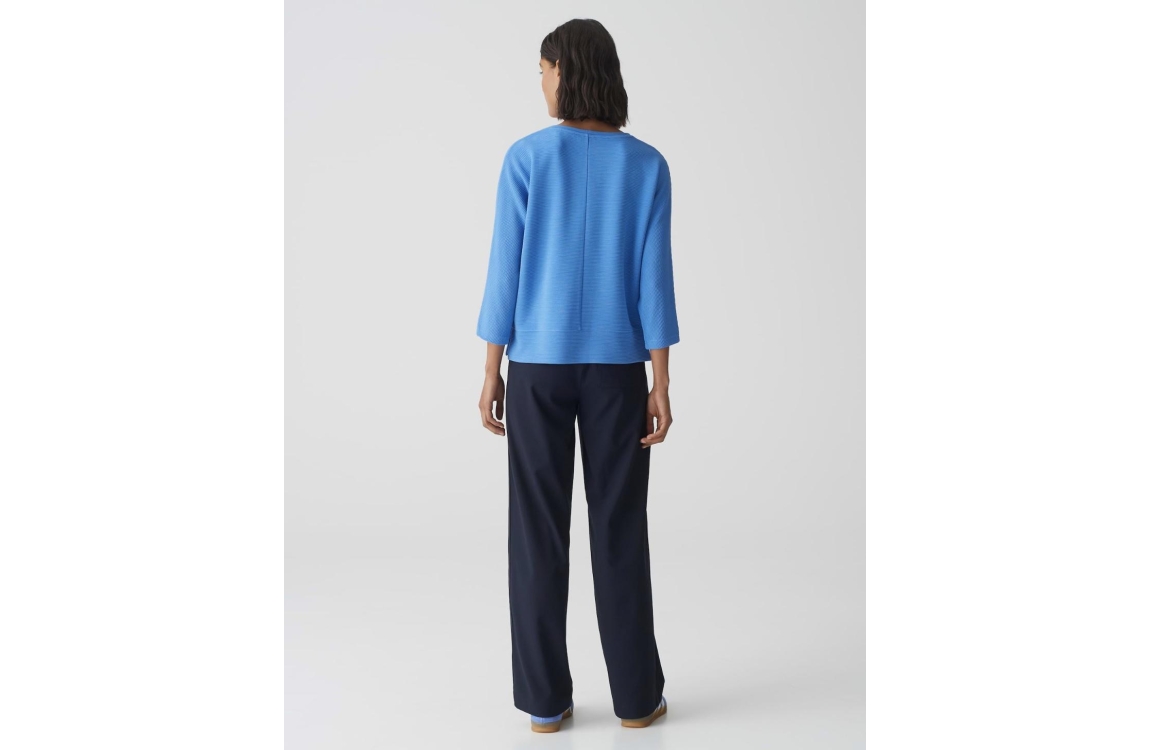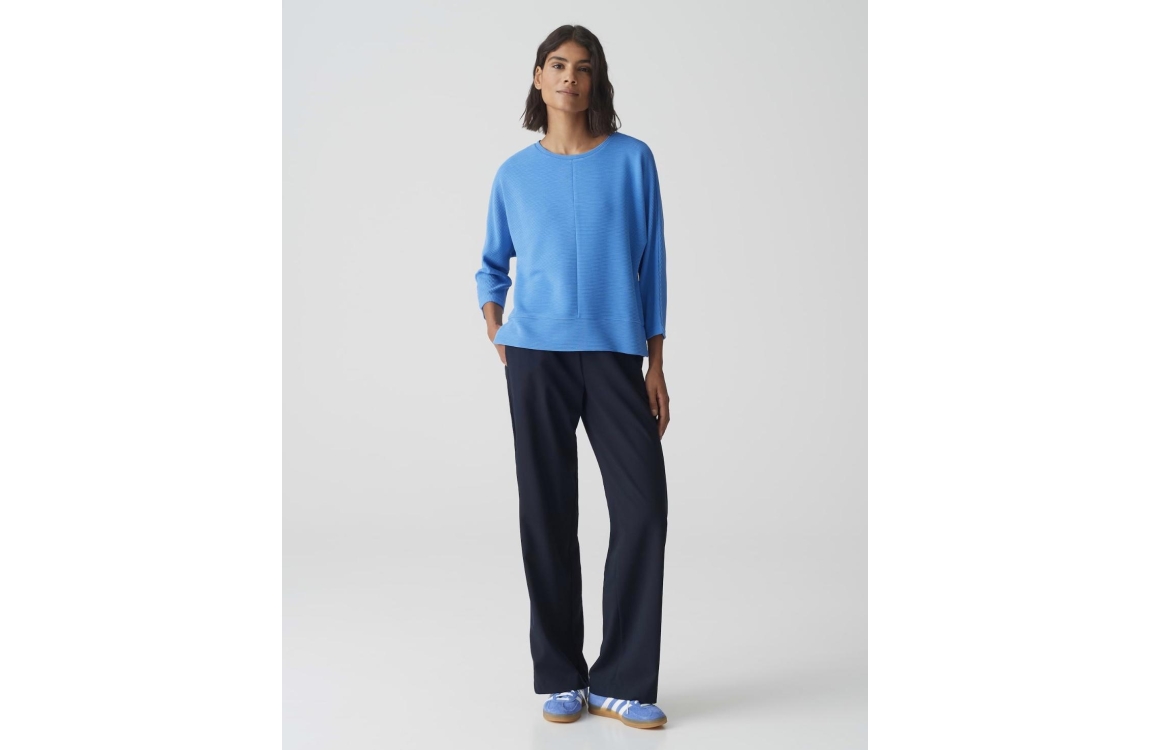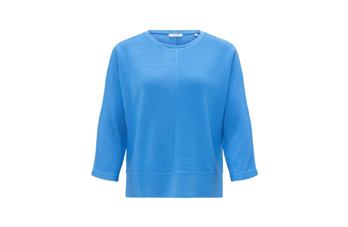 Opus kleding shirt Sinni 10373611140. Dit model is uitgevoerd in een vleermuispasvorm en heeft verkorte lange mouwen. Deze blauwe shirt van Opus is all-over bewerkt met een streepstructuur en is gedetailleerd met splitten in de zijkanten. Dit model is afgewerkt met een overlangse naad op de voor- en achterzijde.