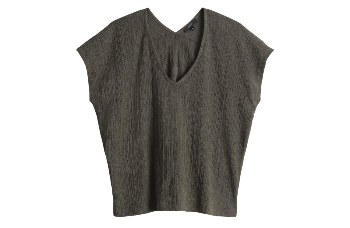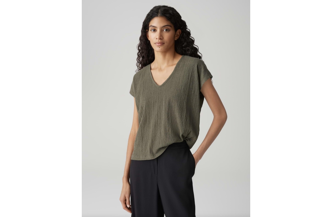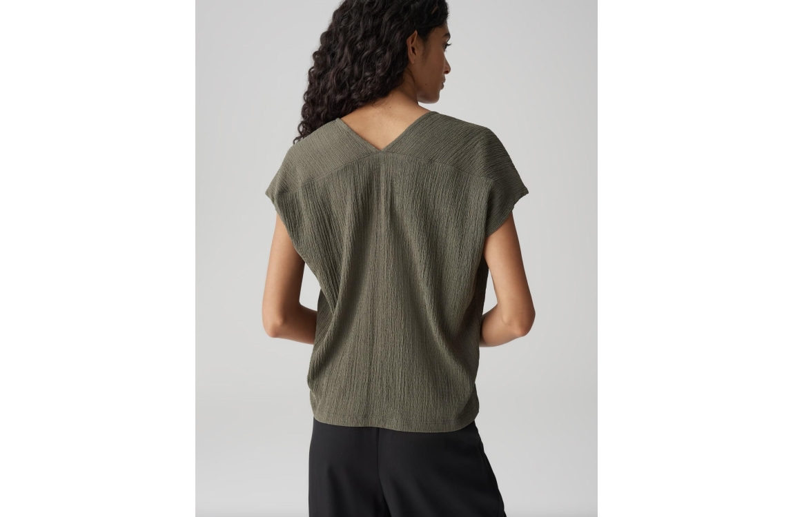 Opus kleding top Sirukus structure 1028825798 900. Dit rechtvallend model heeft een ronde hals en korte afgekapte mouwen. Deze olijfkleurige top van Opus kleding is all-over bewerkt met een crash-structuur en heeft afgewerkte boorden.