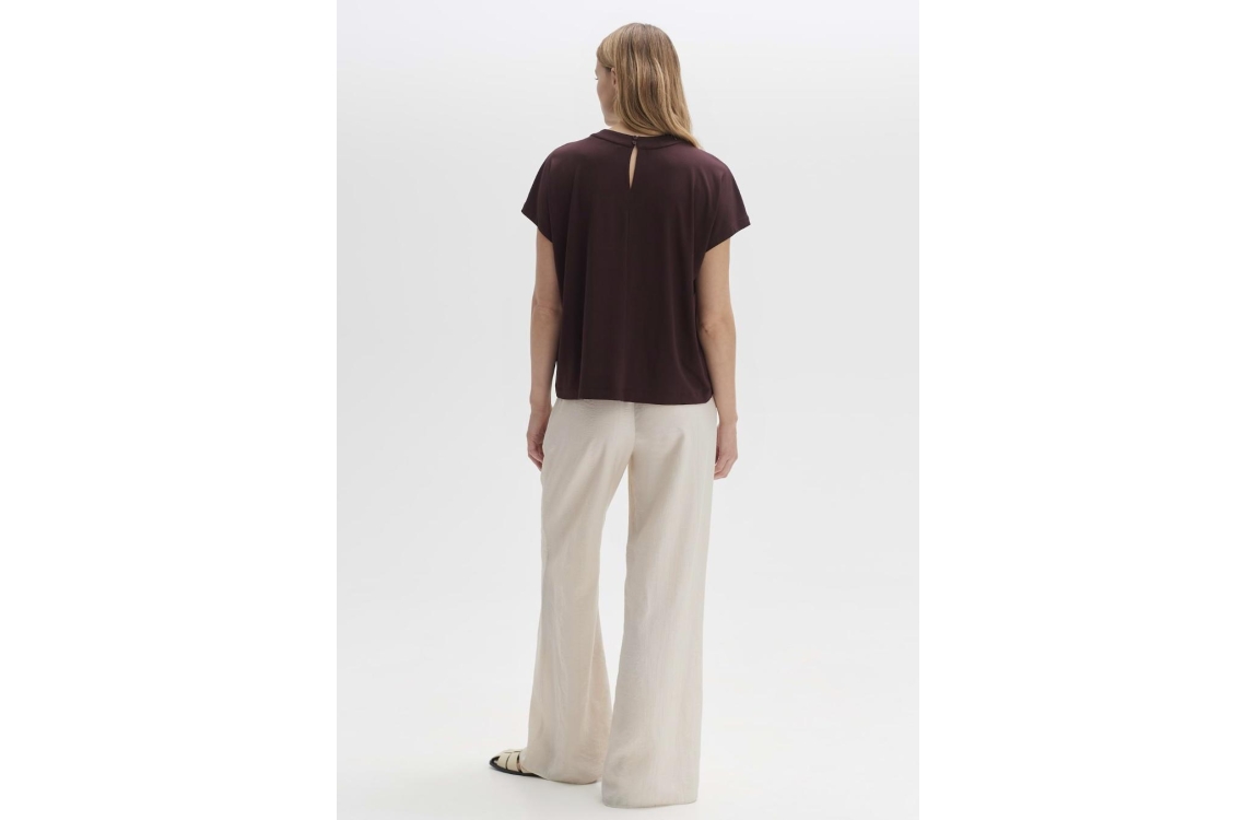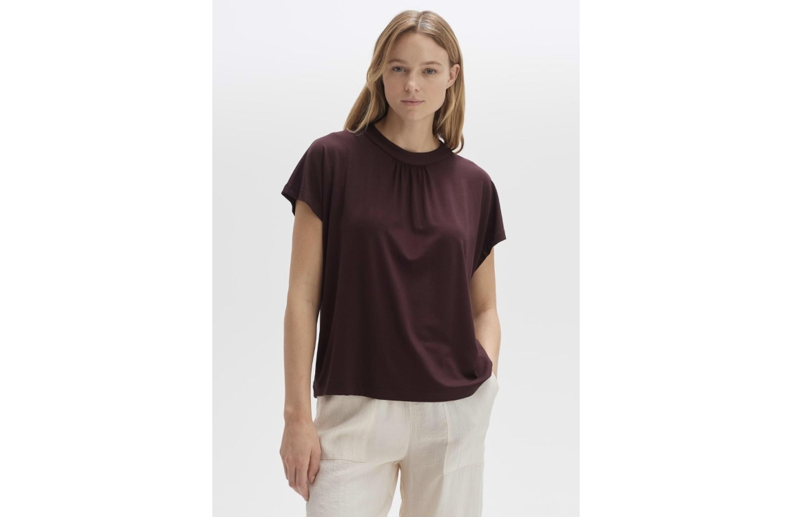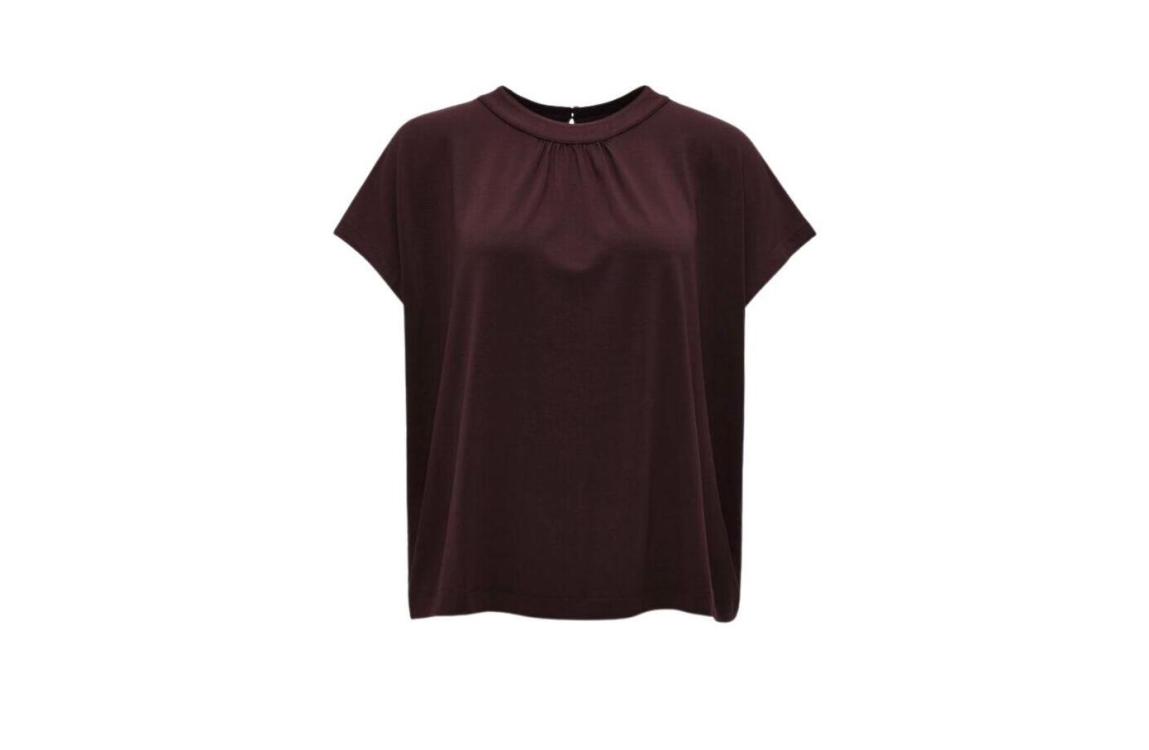 Opus top Sizorello 1029905733. Dit wijdvallend model heeft een ronde hals en korte mouwen. Deze donkerrode top van Opus is afgewerkt met plooien bij de hals en sluit aan de achterzijde door middel van knopen.