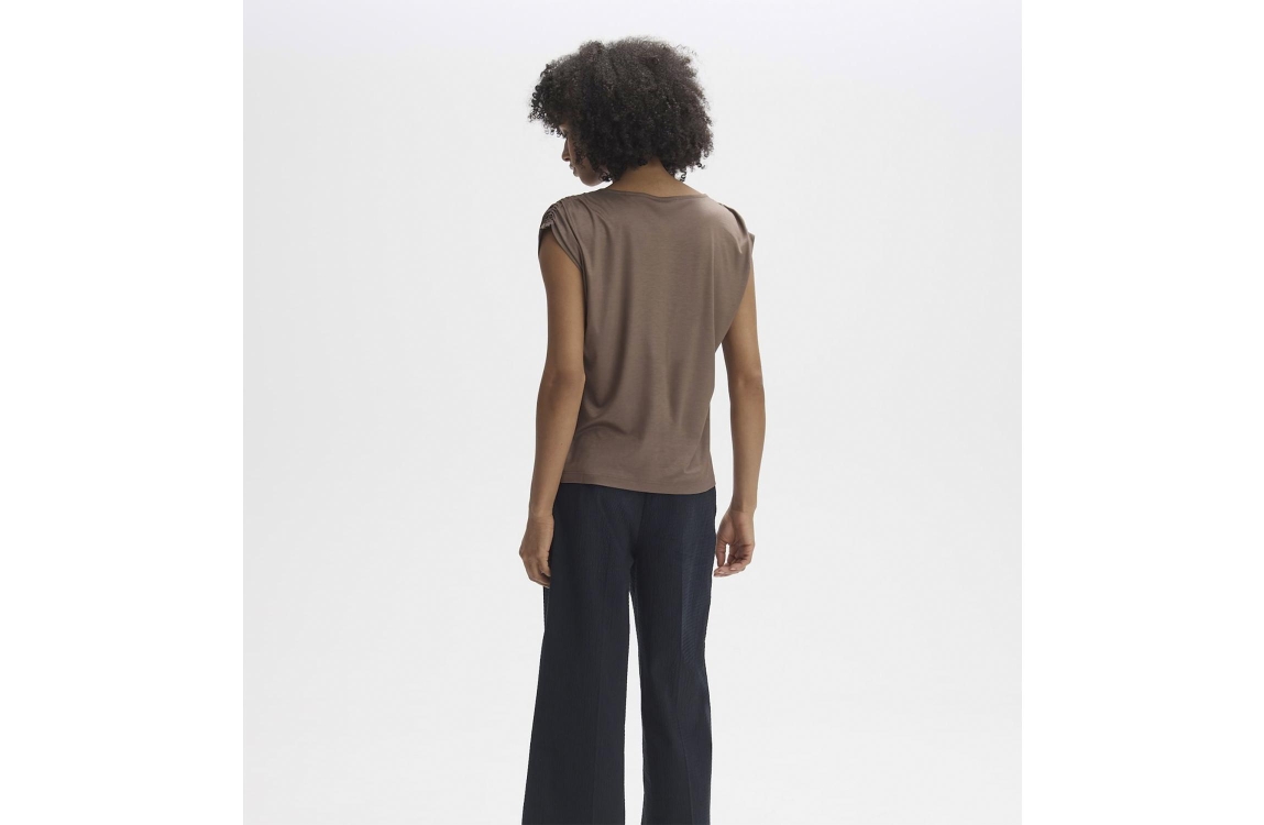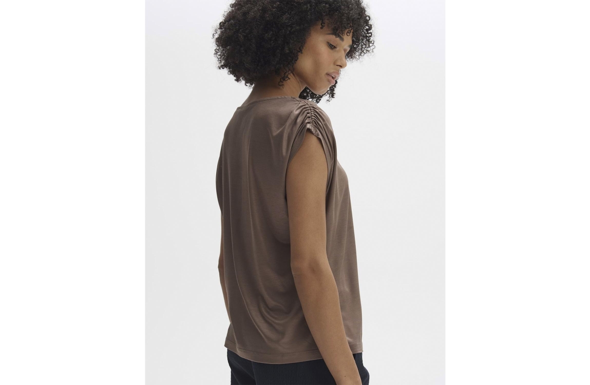 Opus top Soparma. Dit rechtvallende model is voorzien van een wijde hals en heeft korte mouwen. Deze bruine top van Opus is uitgevoerd in een licht glimmende kwaliteit en heeft een plooi partij op de schouder.