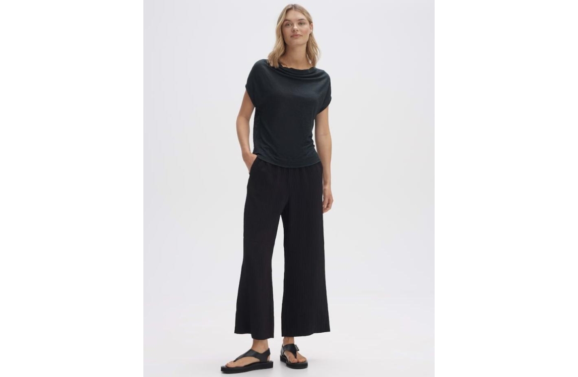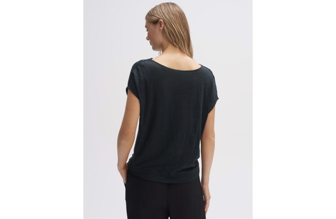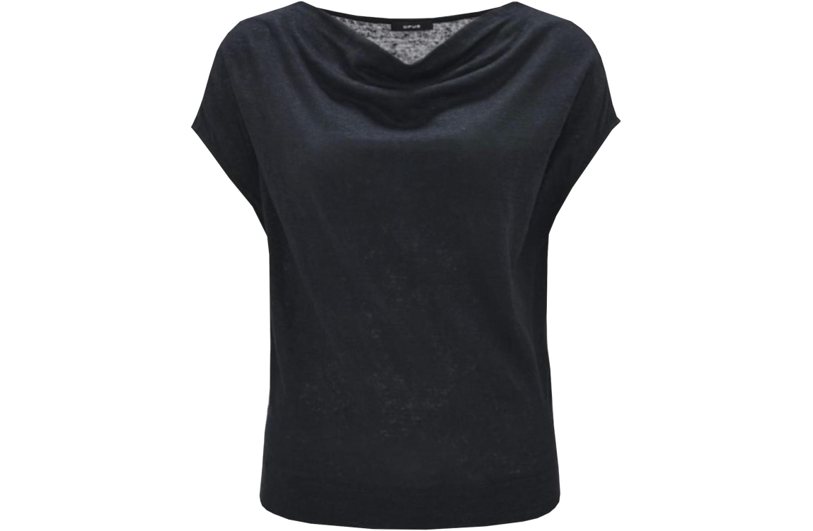 Opus top Subwina 1028784092. Dit soepvallend model heeft een waterval kraag en gevallen schouders. Deze smaragdgroene top van Opus heeft een natuurlijke linnenstructuur en is lichtdoorschijnend.