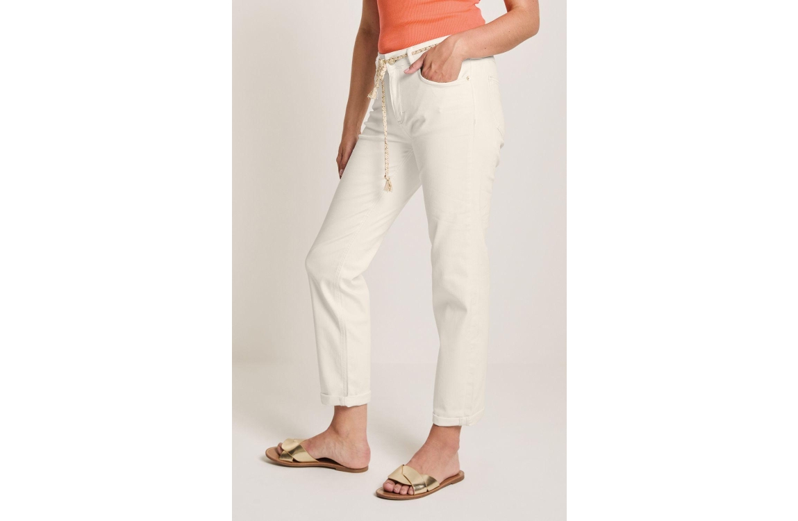 Parami Bobby - Color Denim - 637 - Light O 014 Cream. Dit loose fit model sluit door middel van een knoop en een rits. Deze creme kleurige broek van Parami is voorzien van riemlusjes, 5-pocket zakken en een decoratief gevlochten koord.