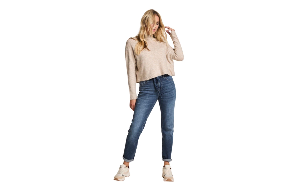 Para Mi jeans Bobby FW251.212091-D135. Dit loose fit sluit door middel van een knoop en rits afgewerkt met ceintuurlussen en een afneembaar strikkoord. Deze blauwe high waist jeans van Para Mi is uitgevoerd in een 5-pocket model.