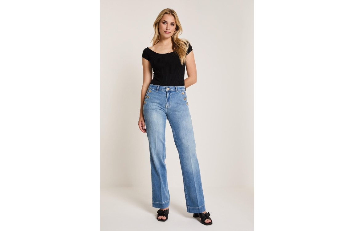 Parami eve (button) - daily denims - d94. Dit wide-fit model sluit door middel van een knoop en rits. Deze blauwe denim jeans van Parami is voorzien van riemlusjes, 5-pocket zakken en knopen op het voorpand. De broek bevat stretch.