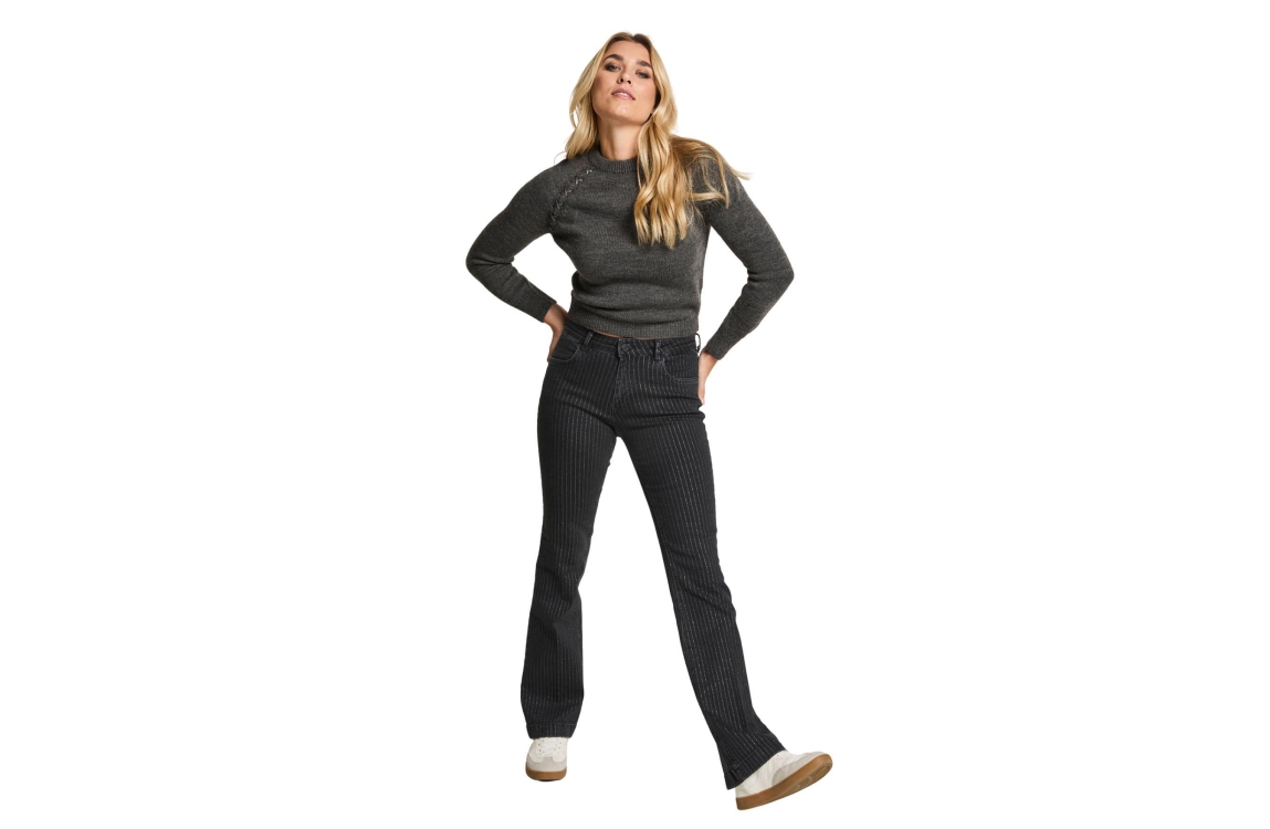 Para Mi jeans Jade FW252.241070. Dit flared model sluit door middel van een knoop en rits afgewerkt met ceintuurlussen. Deze zwarte high waist jeans van Para Mi is uitgevoerd met glitter strepen en beschikt over steekzakken aan de voor- en achterzijde.