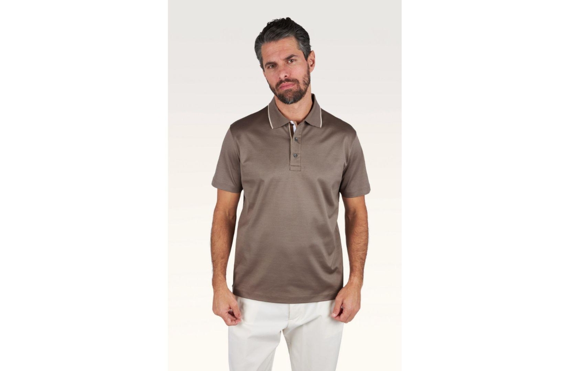 Paul & Shark polo 26411214. Dit regular fit model is voorzien van een kraag afgewerkt met een beige bies en heeft korte mouwen. Dit bruine poloshirt van Paul & Shark sluit door middel van knopen aan de bovenzijde.