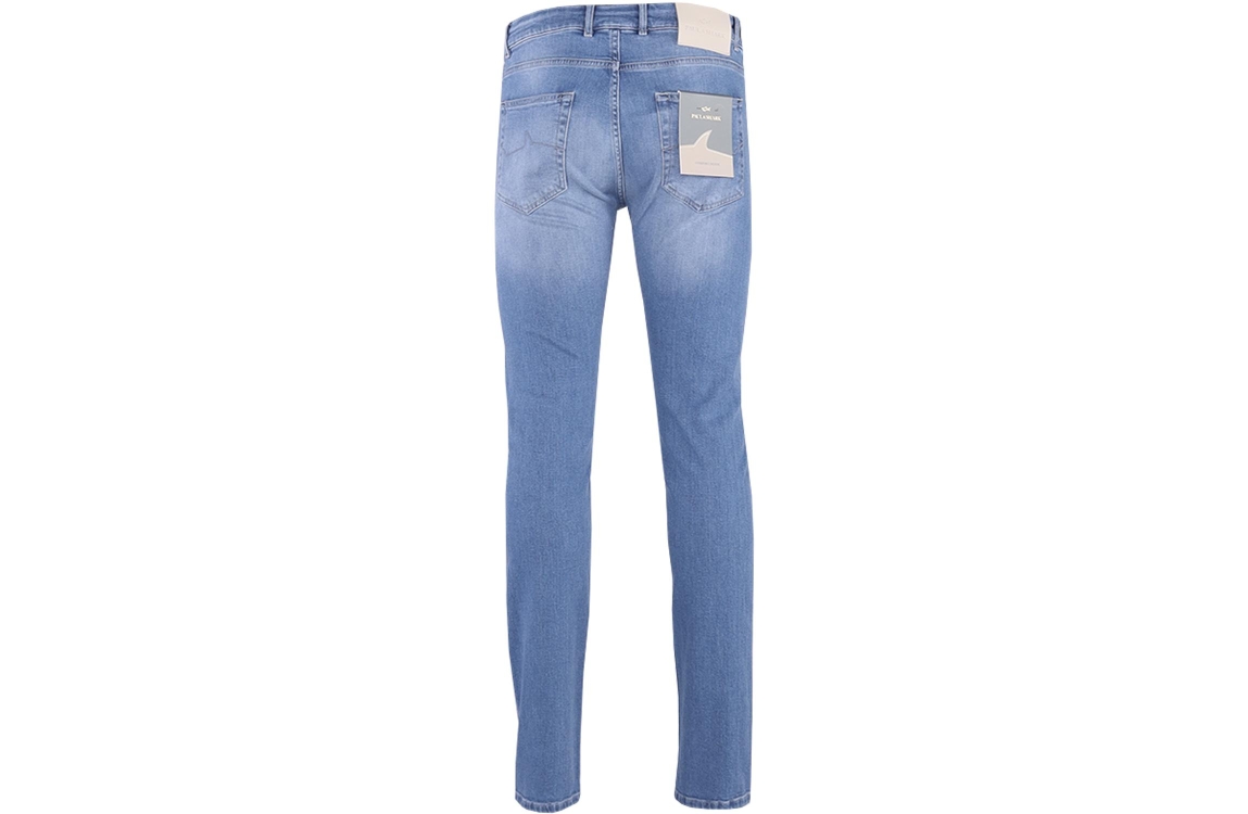 Paul and Shark jeans 25414105 J01. Dit regular fit model sluit door middel van een knoop- en ritssluiting en is voorzien van ceintuurlussen. Deze lichte denim broek van Paul and Shark is uitgevoerd in een 5-pocket model en is afgewerkt met een beige patch aan de achterzijde.