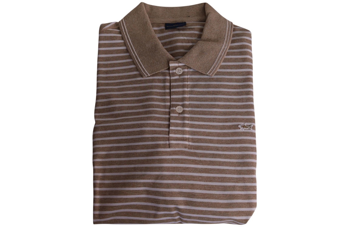 Paul & Shark polo 24411236. Deze rechtvallende polo is voorzien van een kraag en heeft korte mouwen. Deze beige wit gestreepte polo van Paul & Shark sluit door middel van knopen.