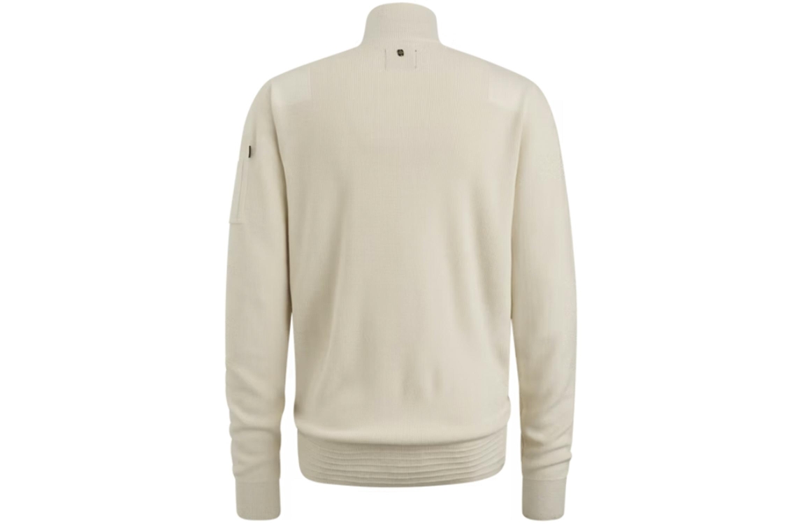 PME Legend trui PKW2309322. Dit rechtvallend model is voorzien van een opstaande kraag en heeft lange mouwen afgewerkt met een zakje op de linkermouw van de drager. Deze créme kleurige trui van PME Legend is geribd uitgevoerd en sluit aan de bovenzijde door middel van een rits en een knoop.