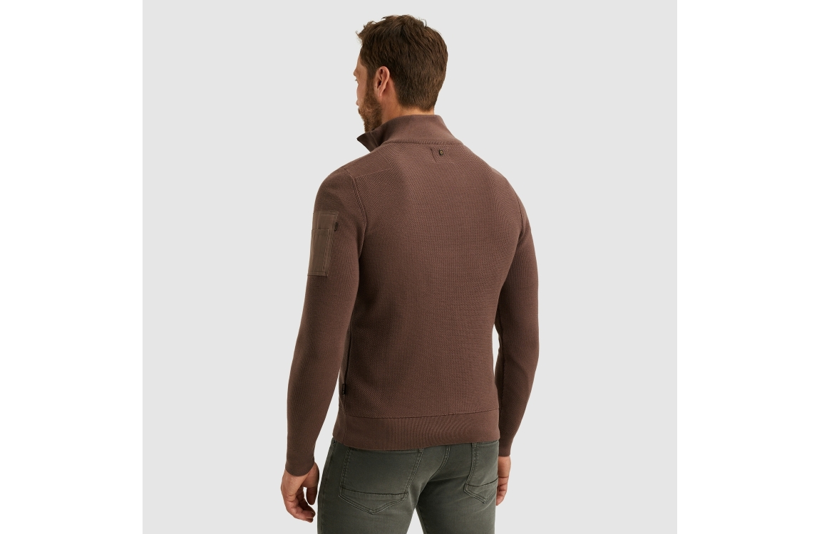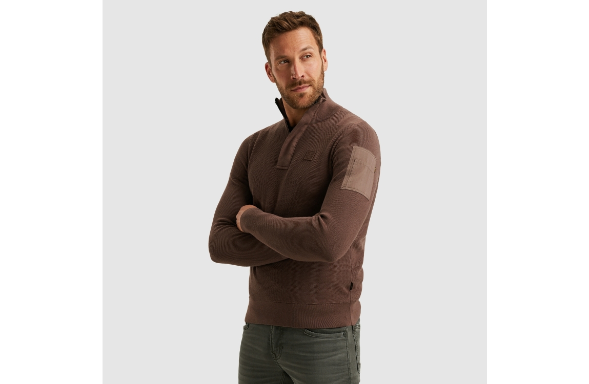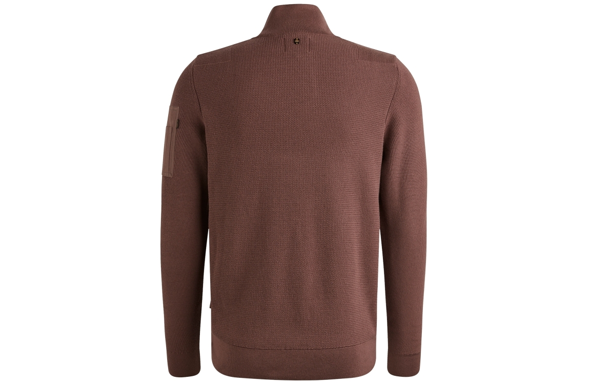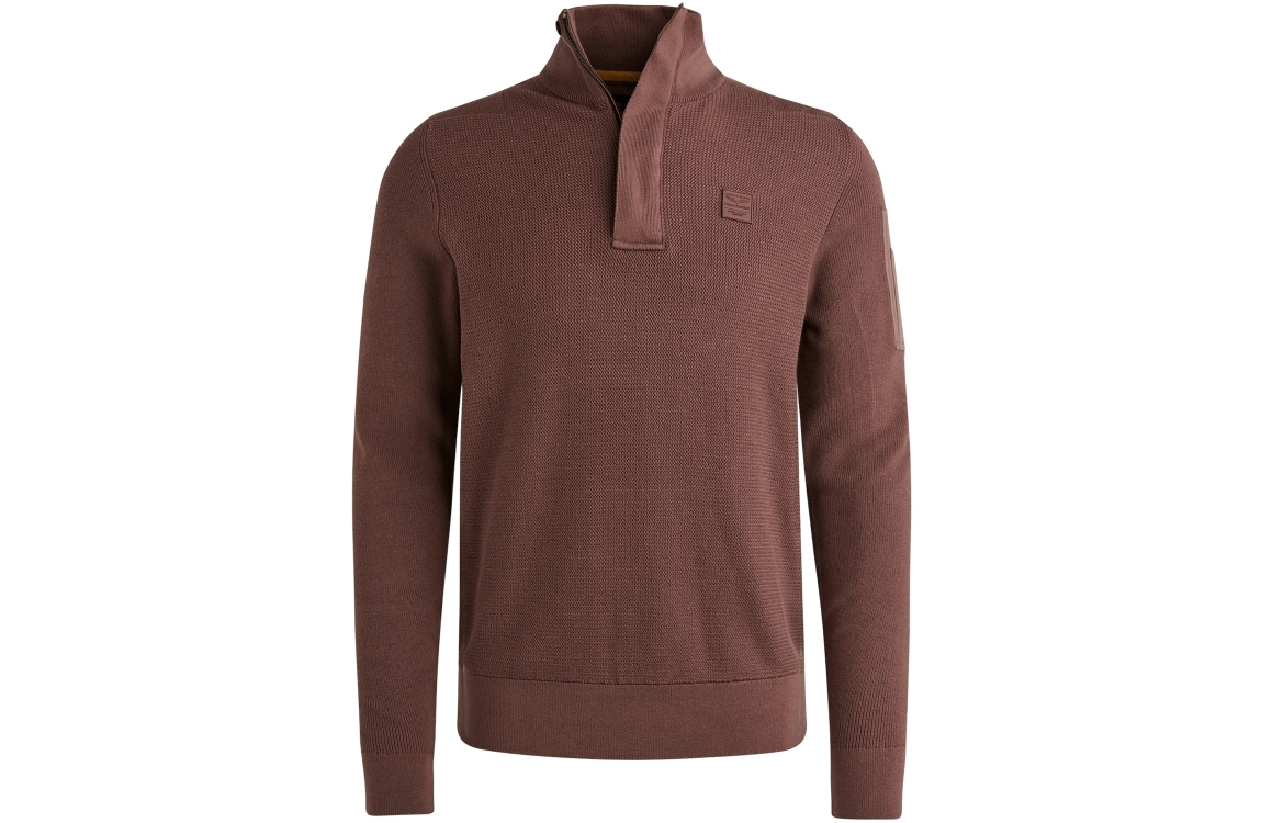 PME Legend pullover pkw2509322. Dit rechtvallend model is voorzien van een opstaande kraag dat sluit door middel van een knoop en rits en heeft lange mouwen. Deze bruin/rode pullover van PME Legend is afgewerkt met merkembleem aan de voorzijde en zakje aan de zijkant.