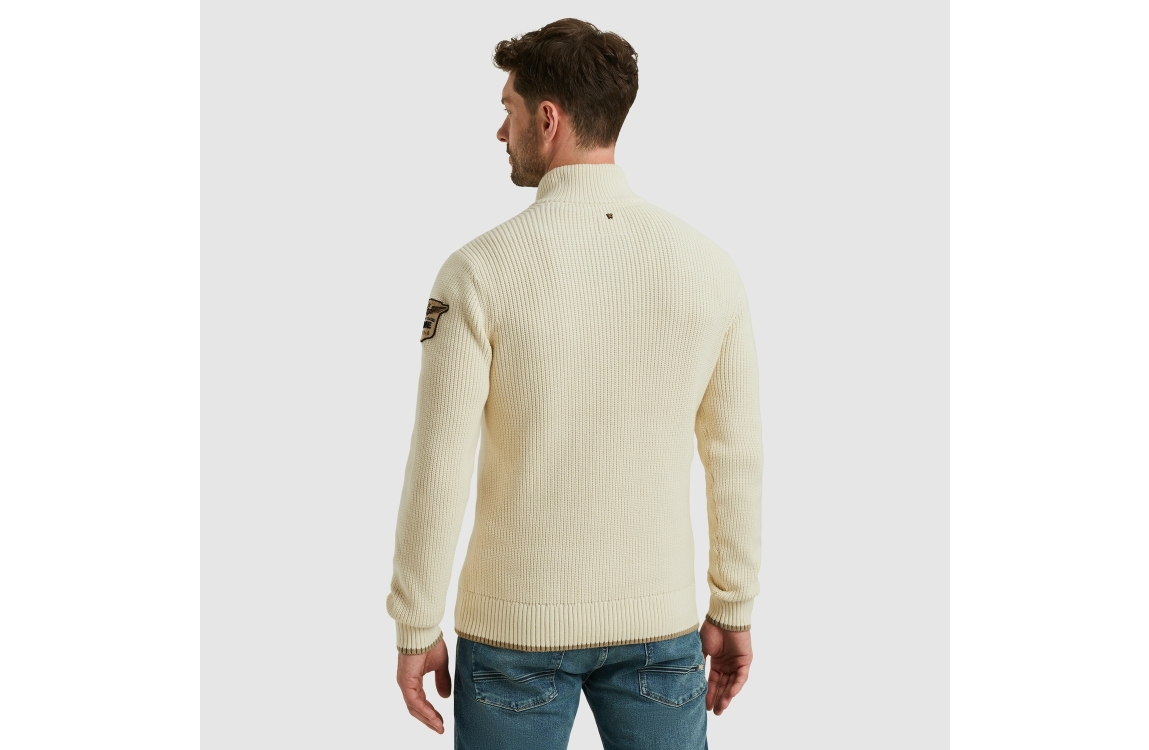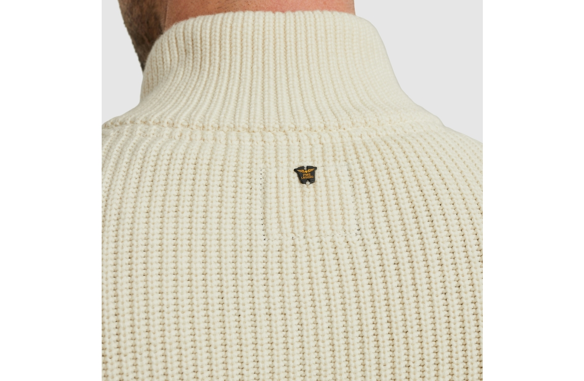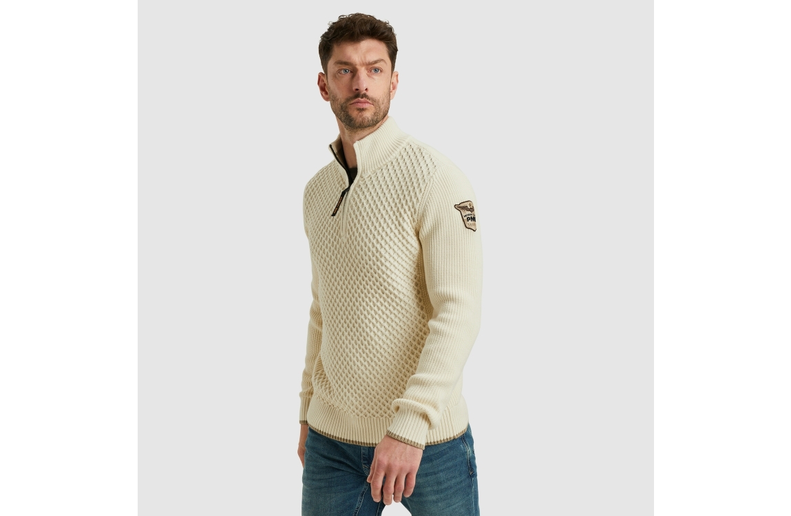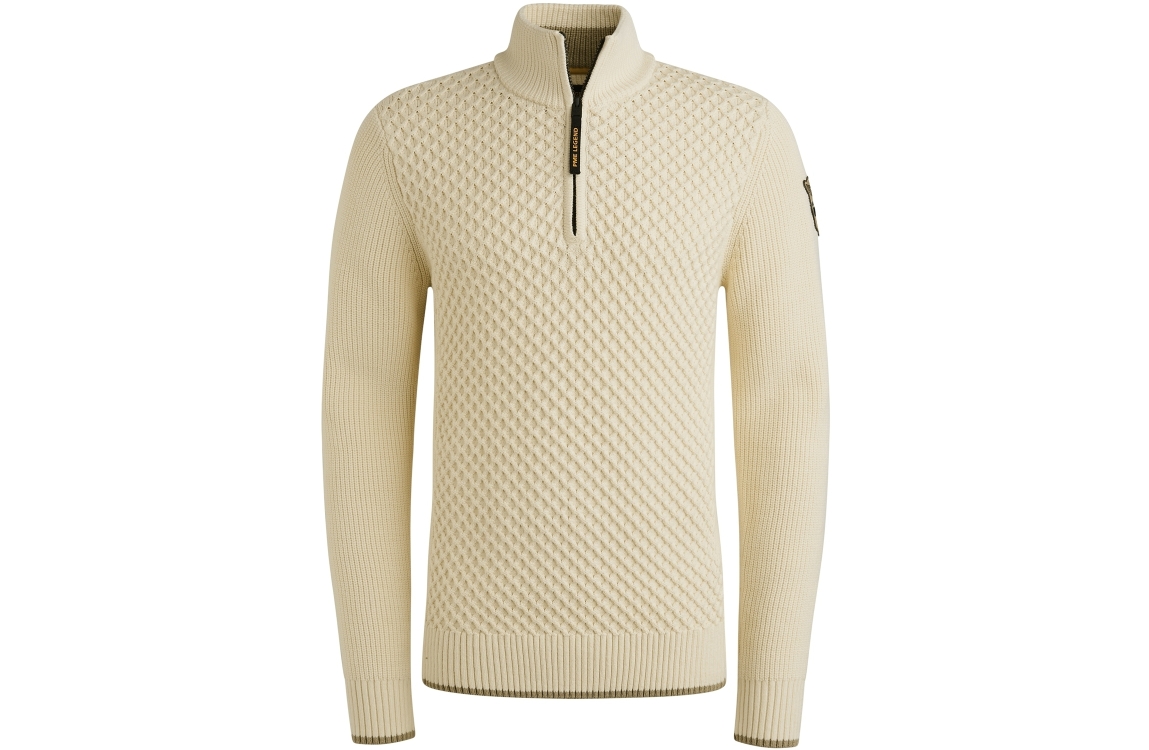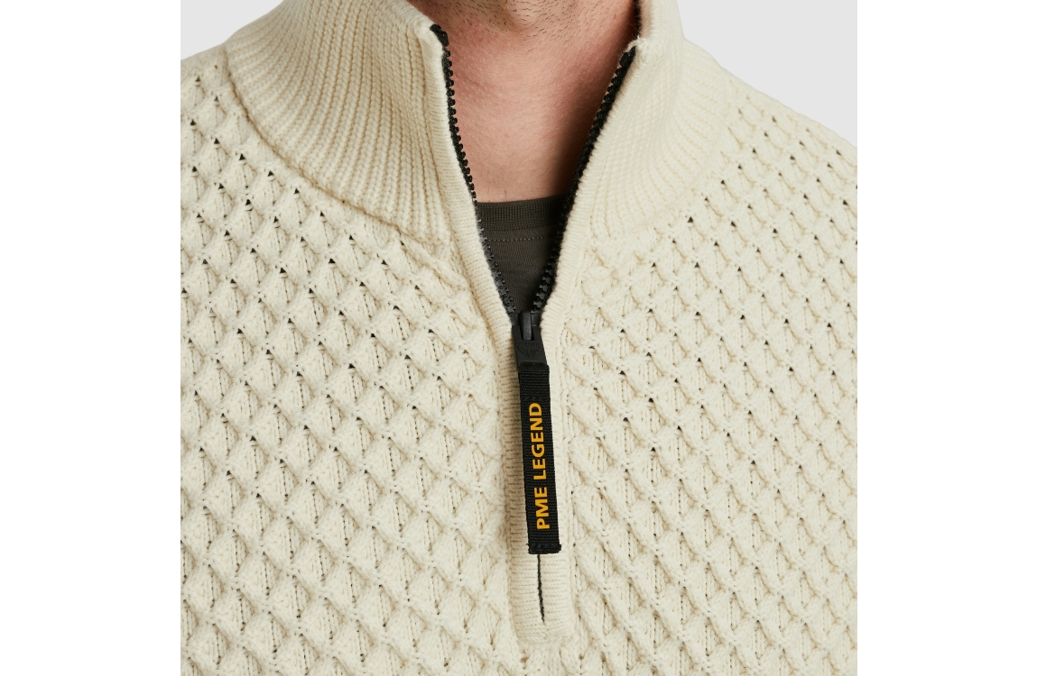 PME Legend Half zip pullover PKW2509324. Het regular fit model heeft een col met rits en lange mouwen. Deze offwhite pullover van PME Legend is uitgevoerd in een grof gebreid materiaal.