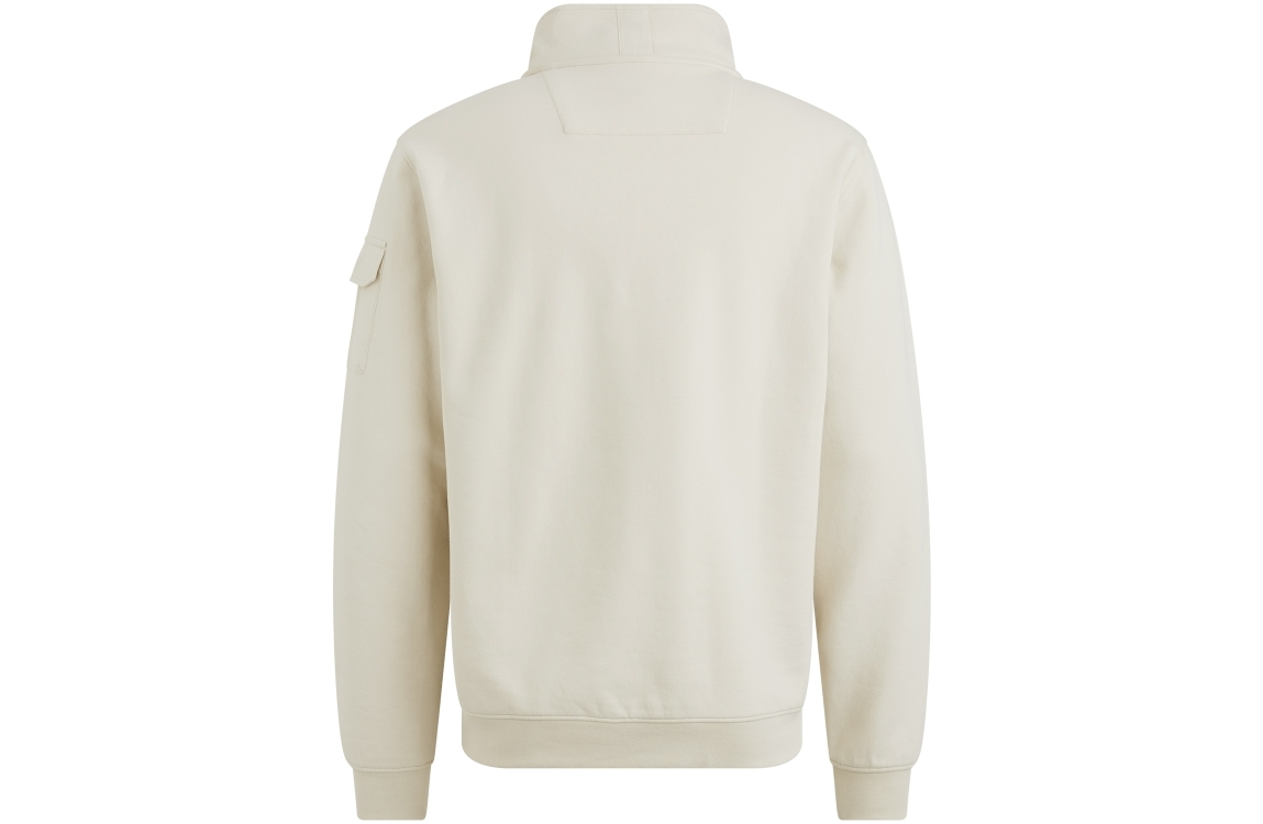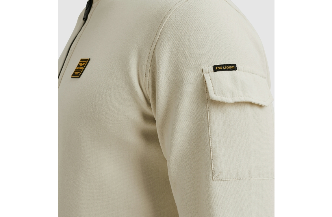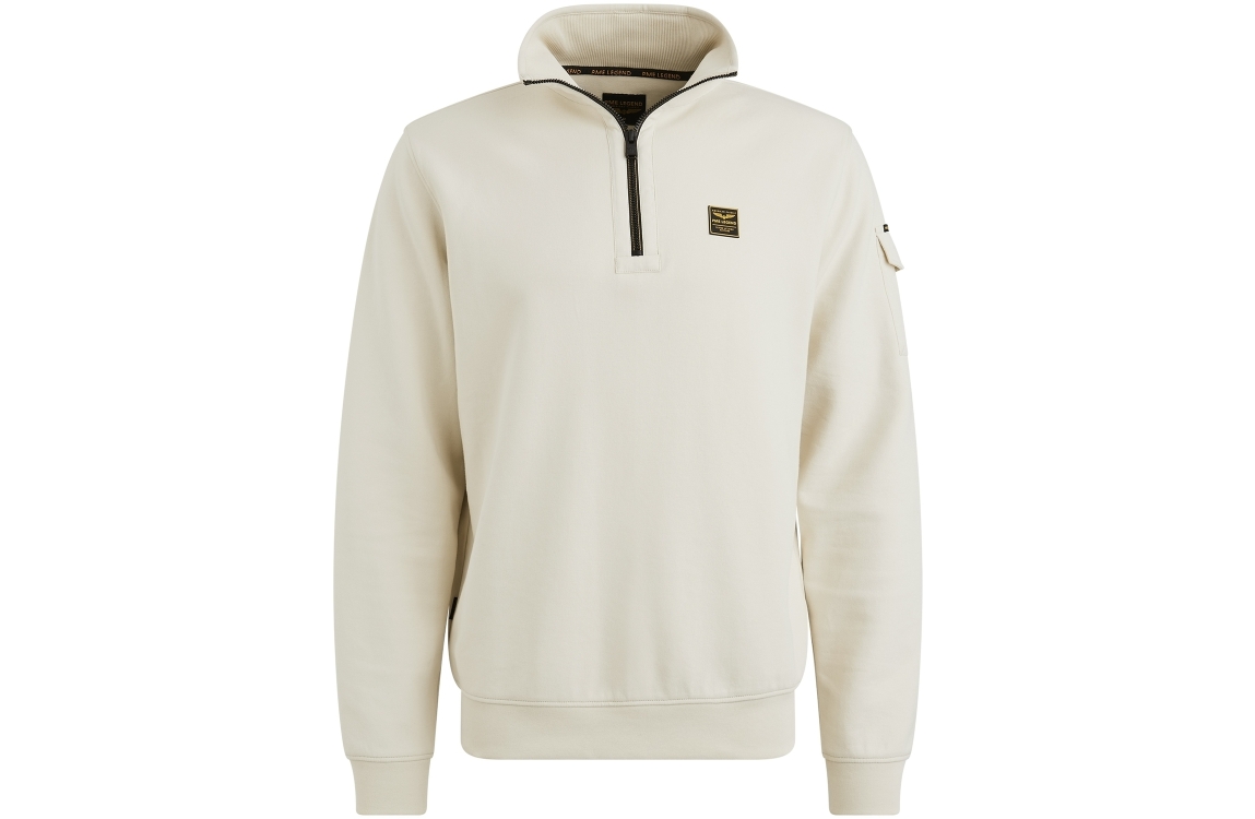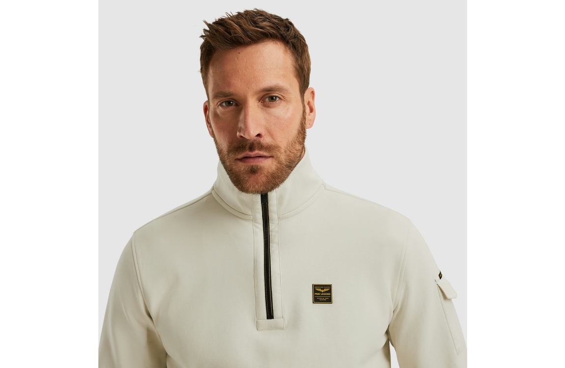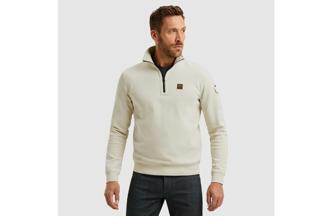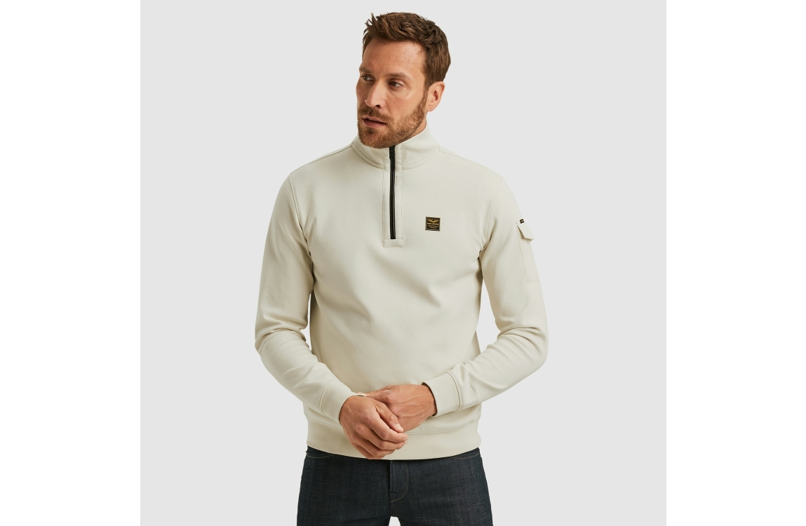 PME Legend pullover PSW2508423. Dit regular fit model vest heeft een opstaande kraag en lange mouwen. Dit witte pullover van PME Legend sluit doormiddel van een halfzip rits en heeft een zakje op de linker mouw.