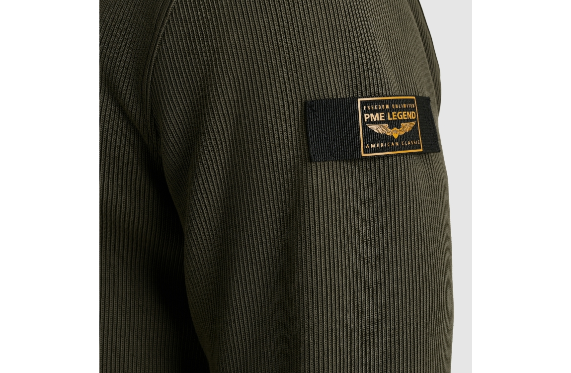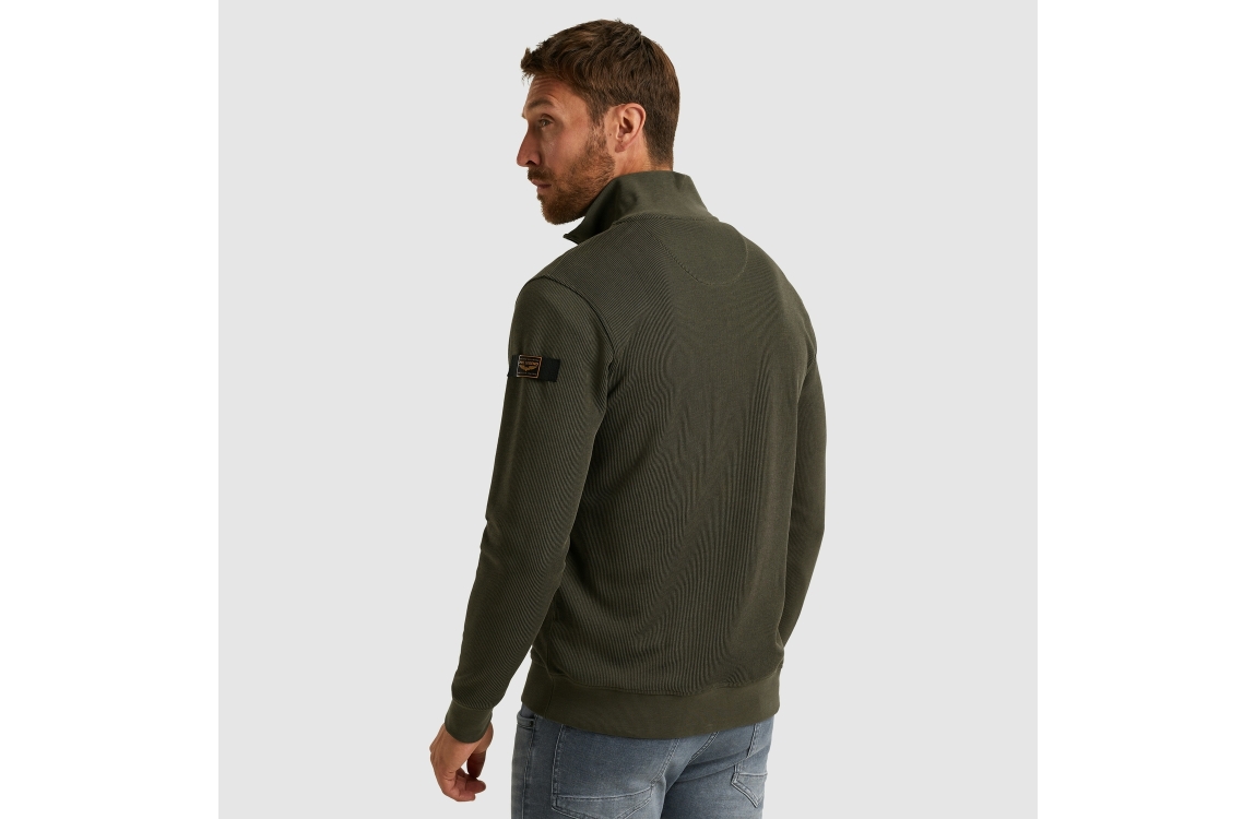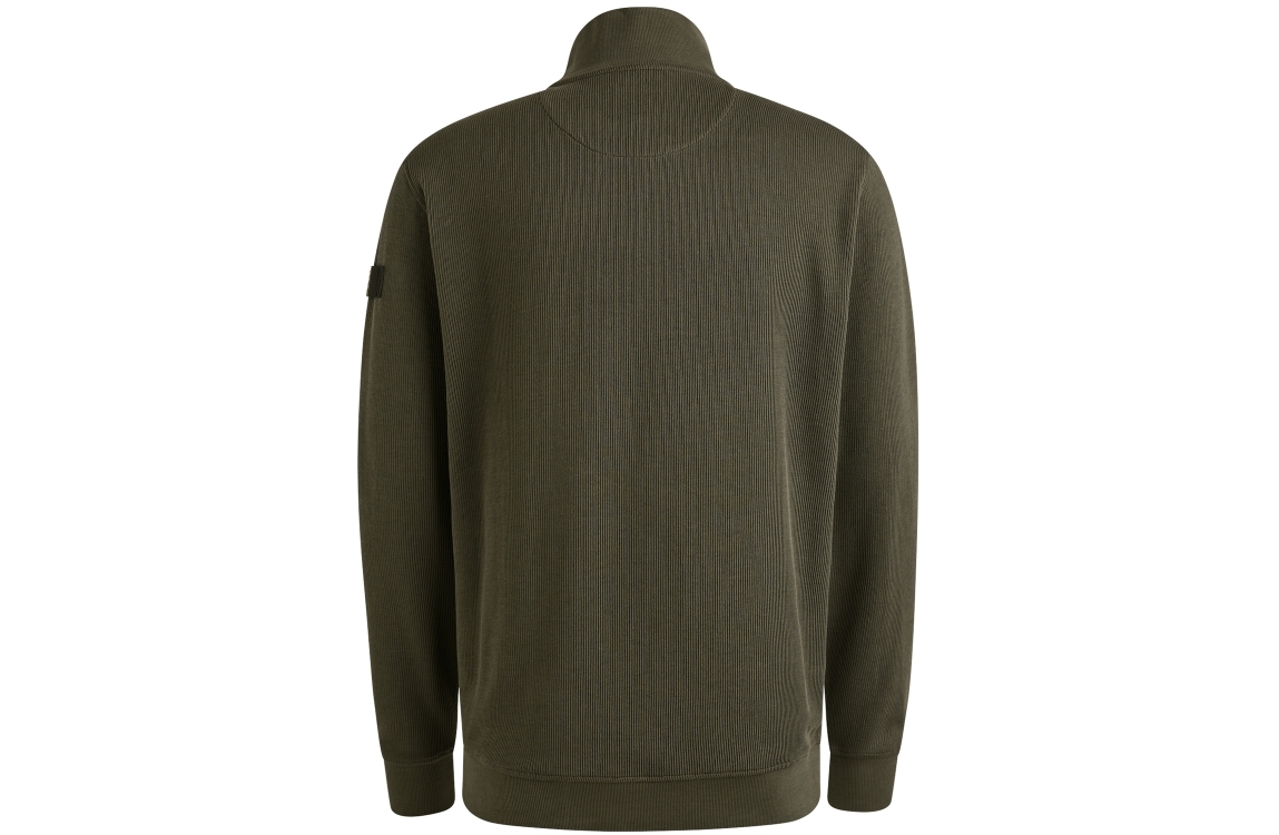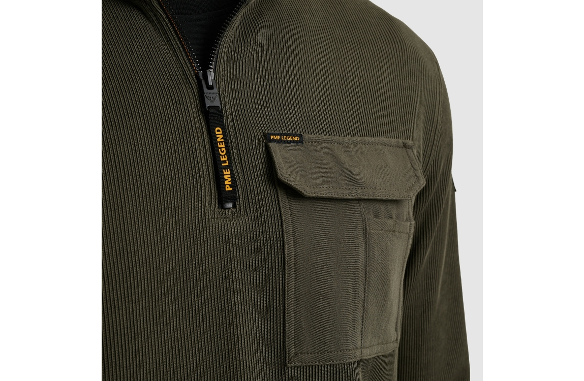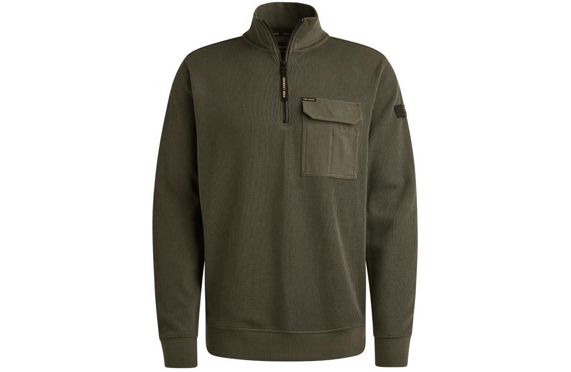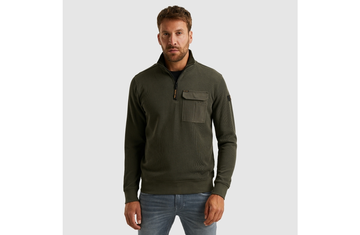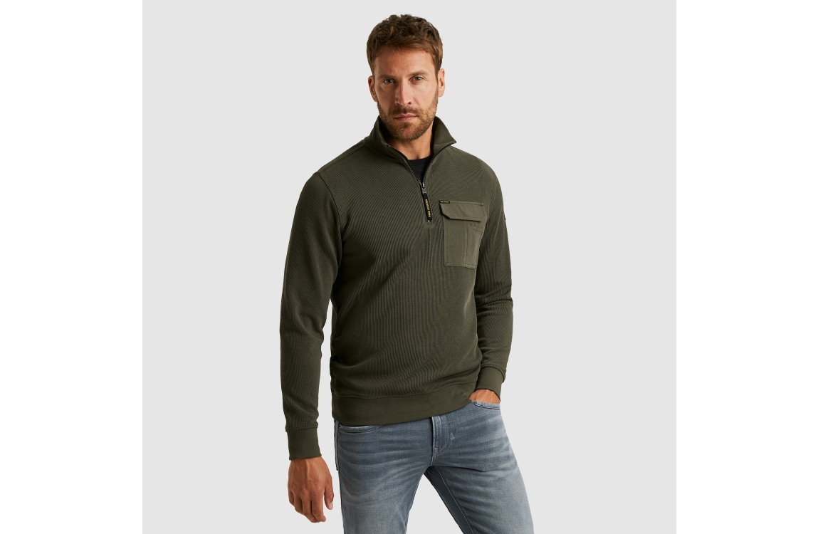 PME Legend pullover PSW2508423. Dit regular fit model vest heeft een opstaande kraag en lange mouwen. Dit doner bruine pullover van PME Legend sluit doormiddel van een halfzip rits en heeft een zakje op de linker mouw en borst.