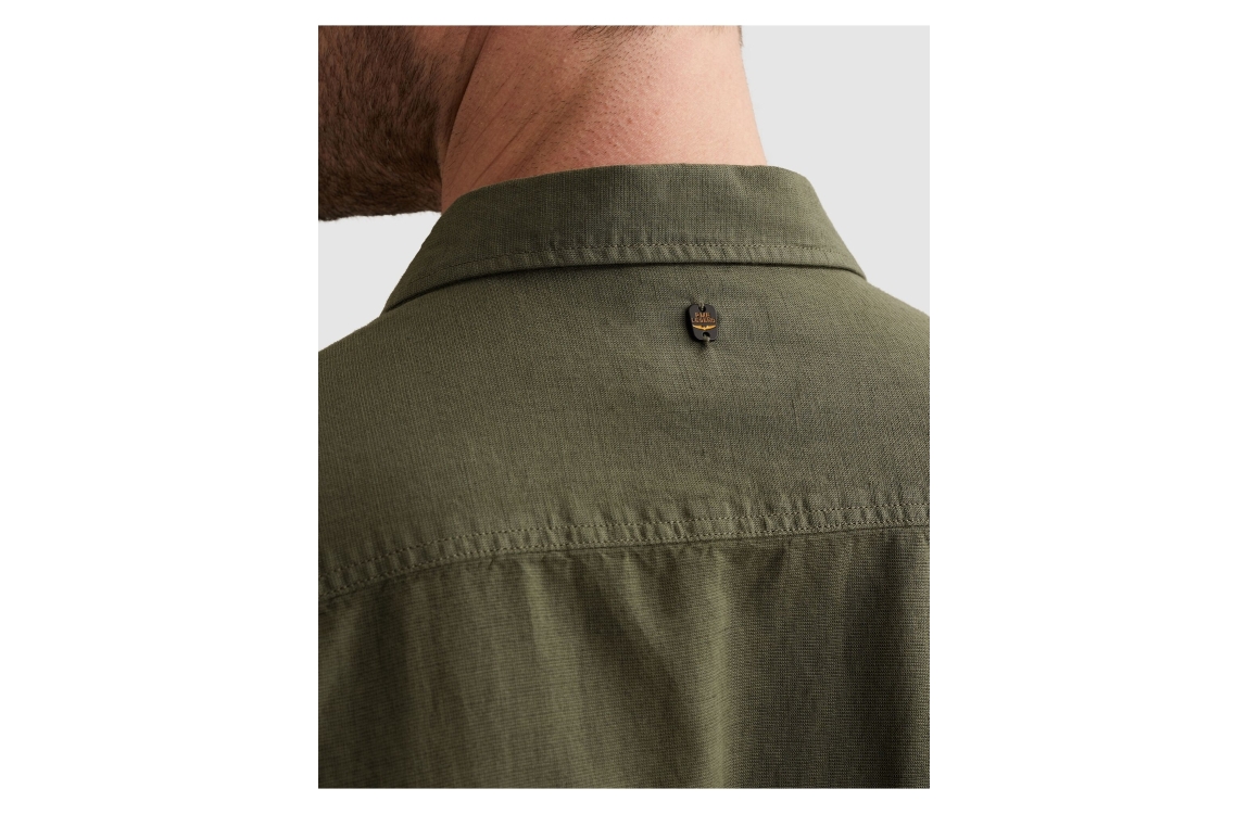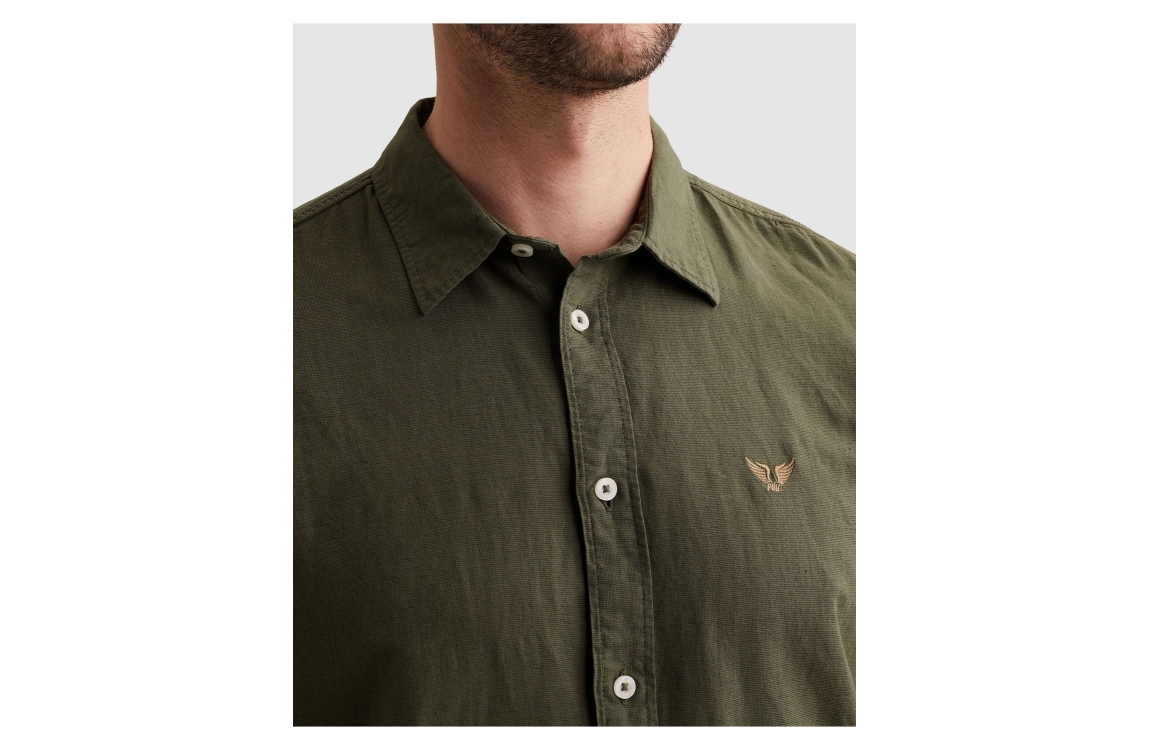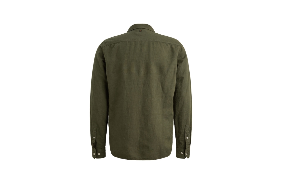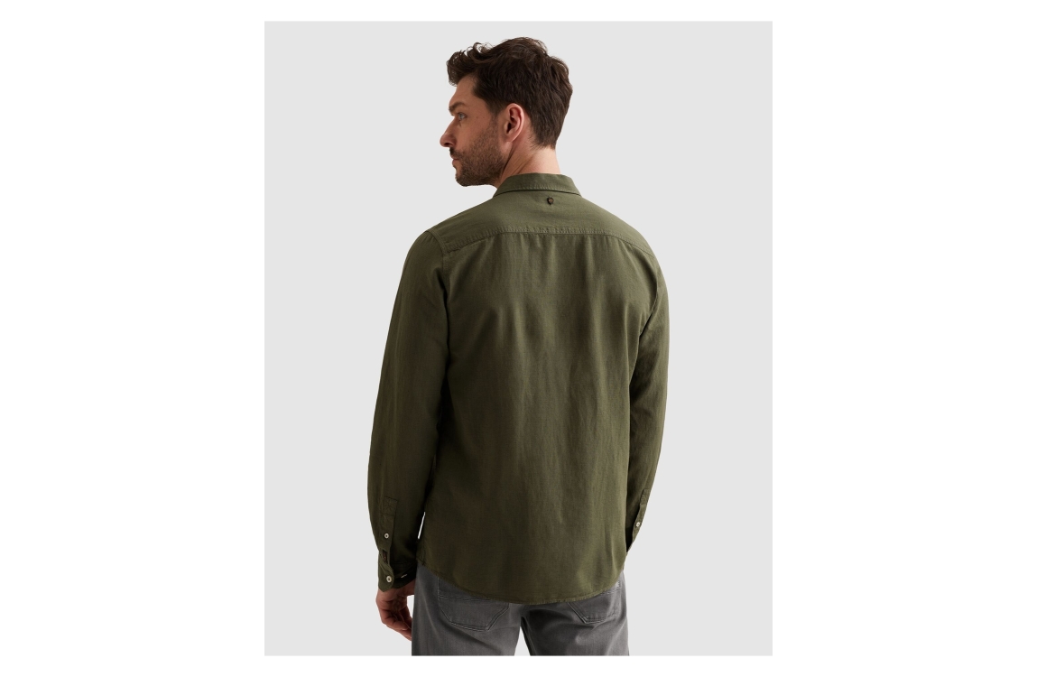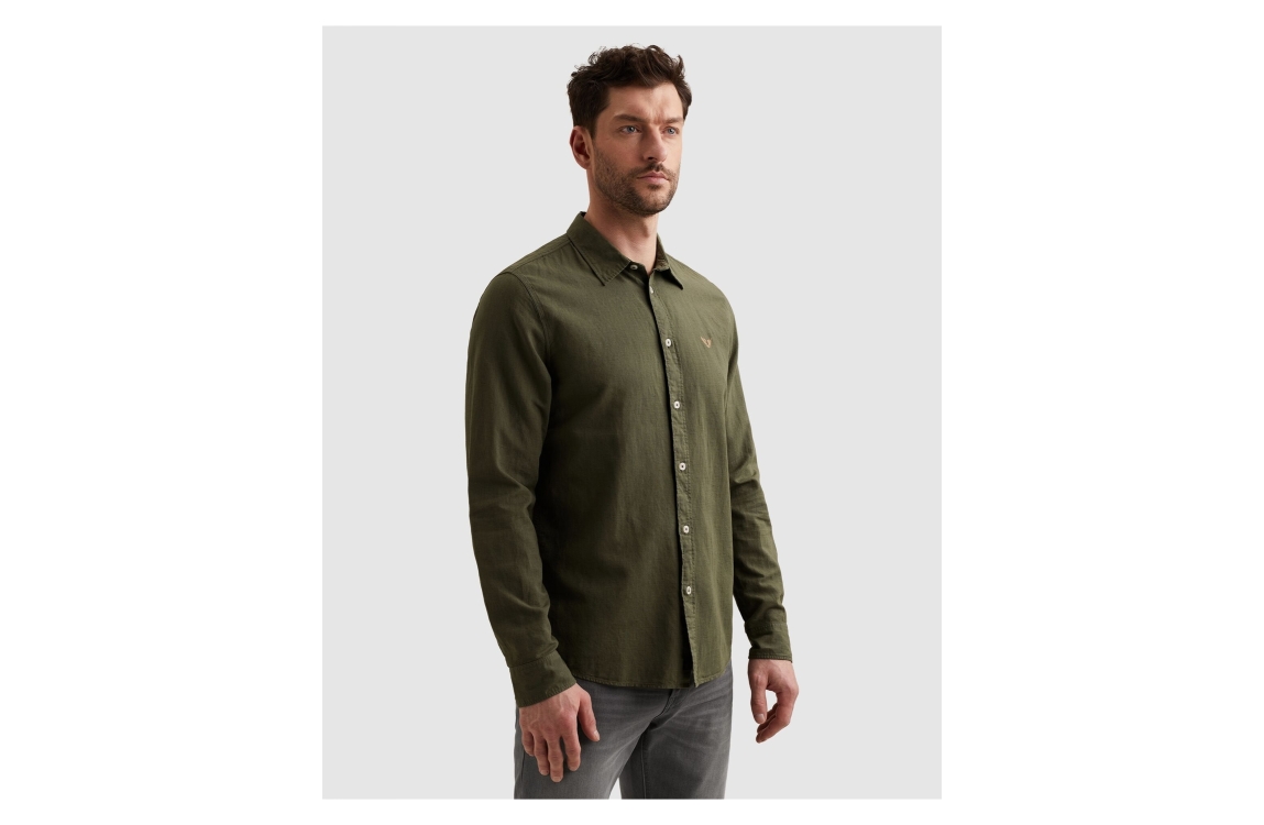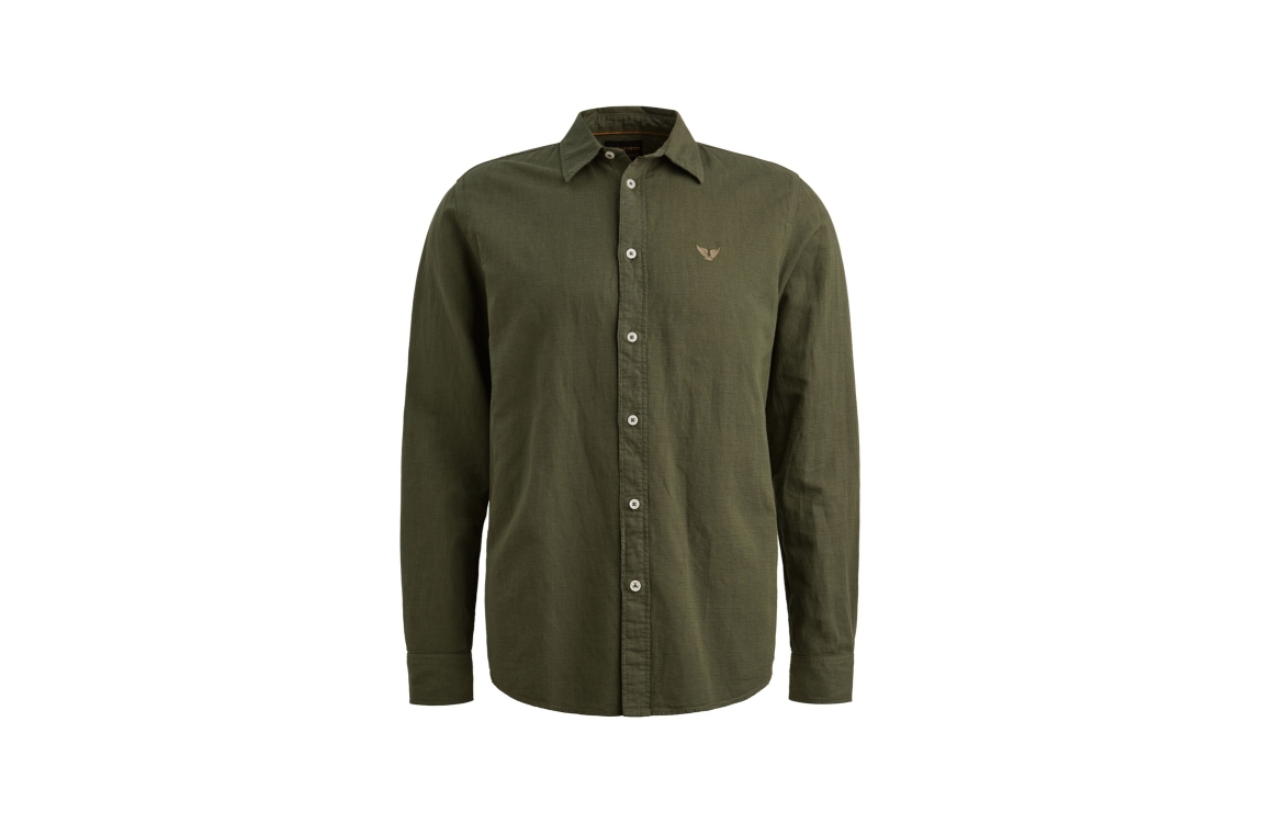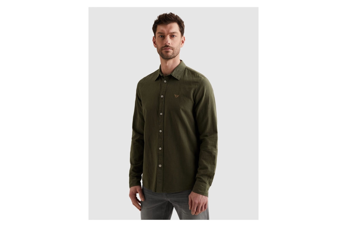 PME Legend overhemd PSI2603243 6150. Dit regular fit model heeft een kraag en lange mouwen. Deze donkergroene overhemd van PME Legend sluit aan de voorzijde door middel van knopen en is op de linkerborst gedetailleerd met het merkembleem.