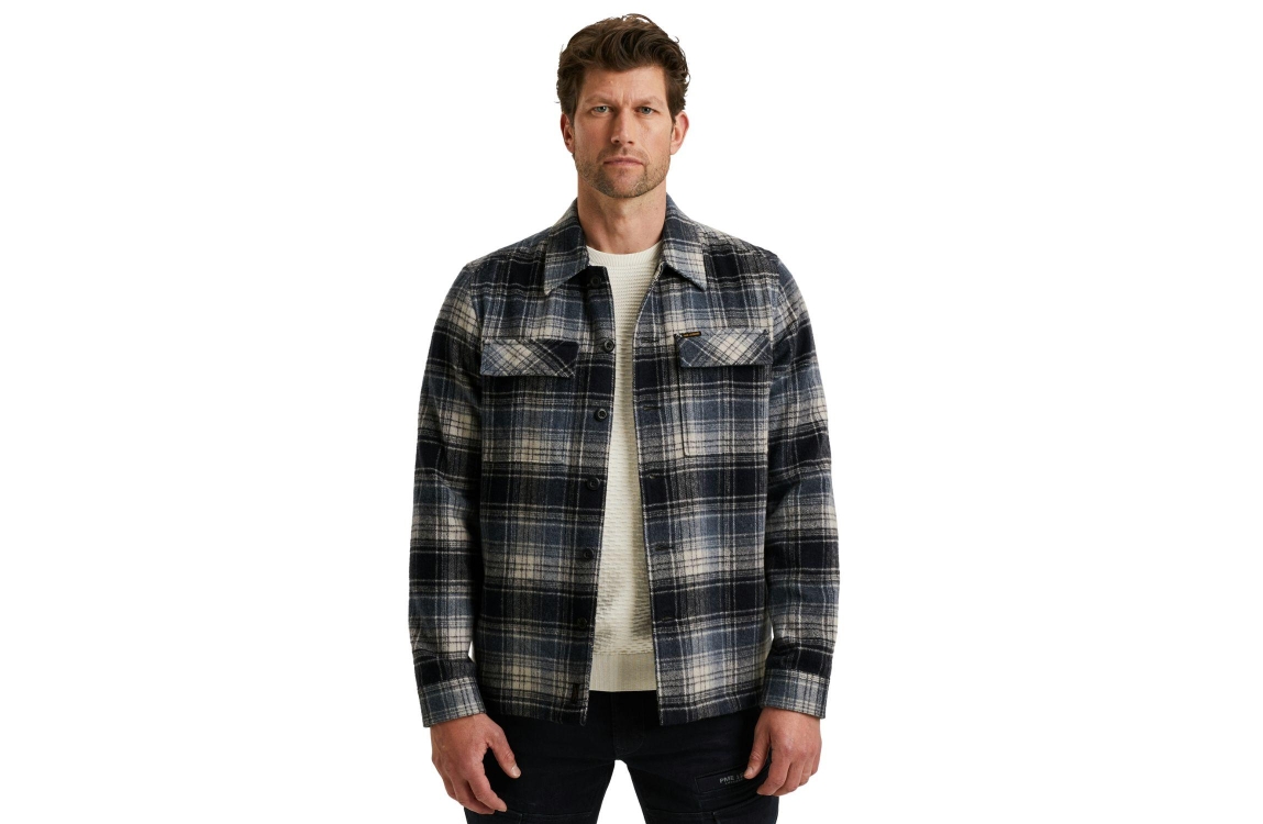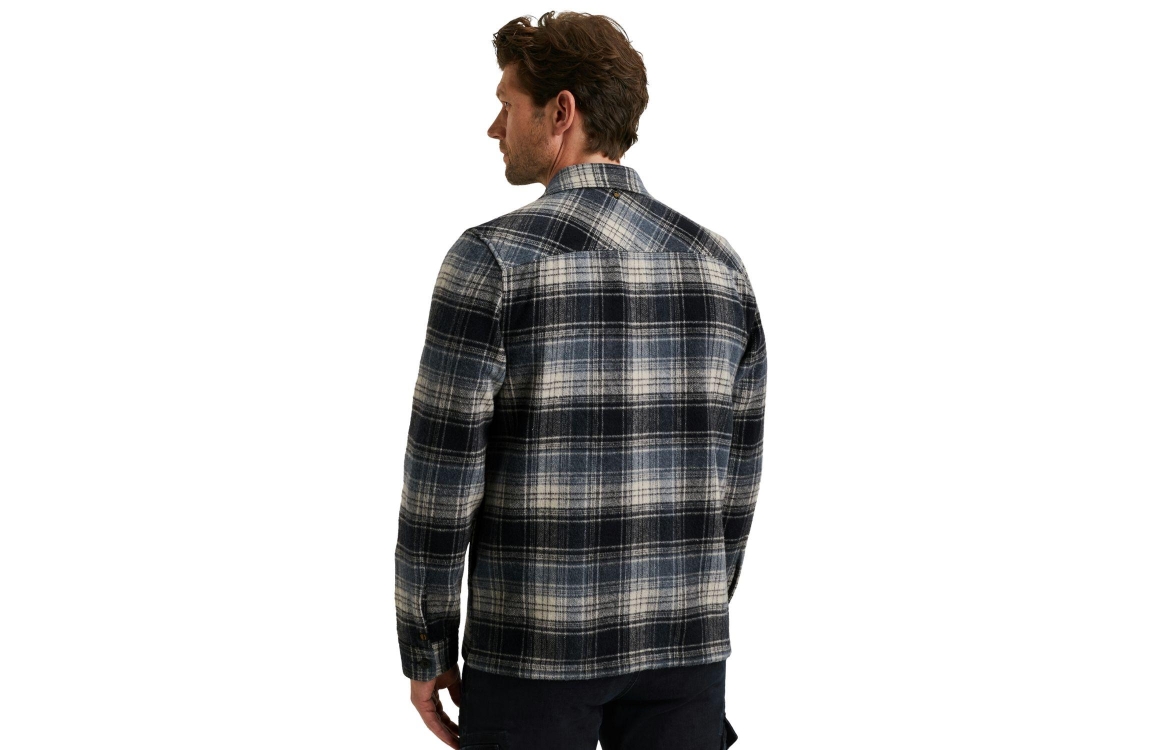 PME Legend overhemd PSI2511260 5282. Dit rechtvallende model heeft een kraag en lange mouwen. Deze donkerblauwe overhemd van PME Legend sluit aan de voorzijde door middel van knopen en is voorzien van twee borstzakken. Het model is all-over bewerkt met een blokpatroon en is afgewerkt met sluitbare manchetten.