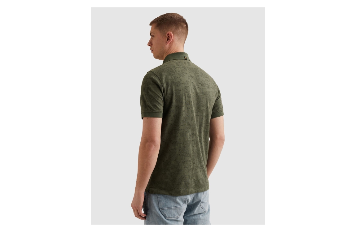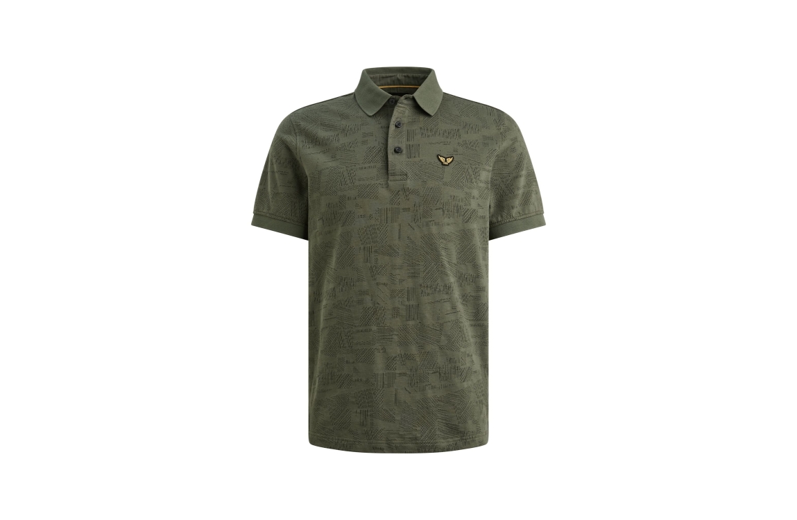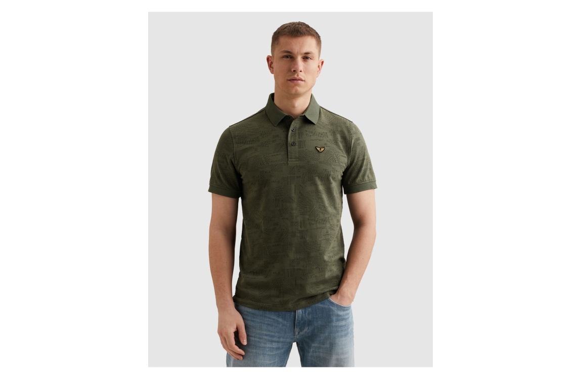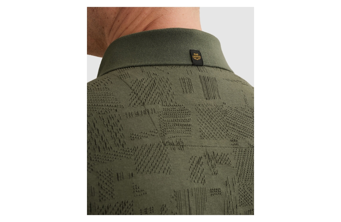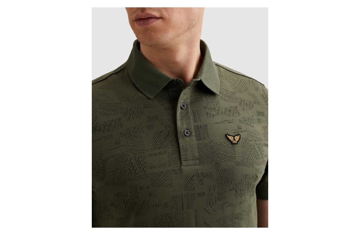PME Legend polo PPSS2603883. Dit regular fit model is voorzien van een kraag en heeft korte mouwen. Deze donkergroene polo van PME Legend sluit aan de voorzijde door middel van knopen. Dit model is bewerkt met een motief.