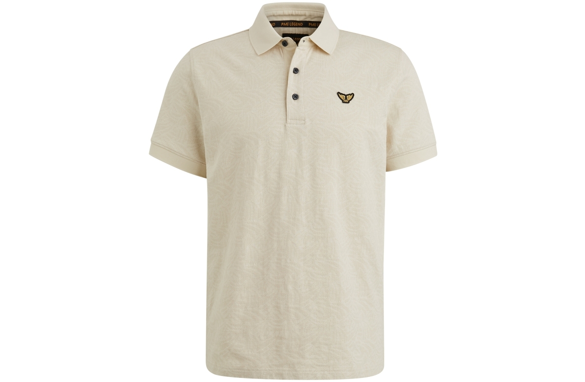 PME Legend short sleeve polo jacquard jersey. Dit regular fit model heeft korte mouwen en een omgeslagen kraag. Deze bone witte polo van PME Legend is afgewerkt met 2 splitten aan de onderkant en heeft een all-over patroon en merkembleem op de borst.